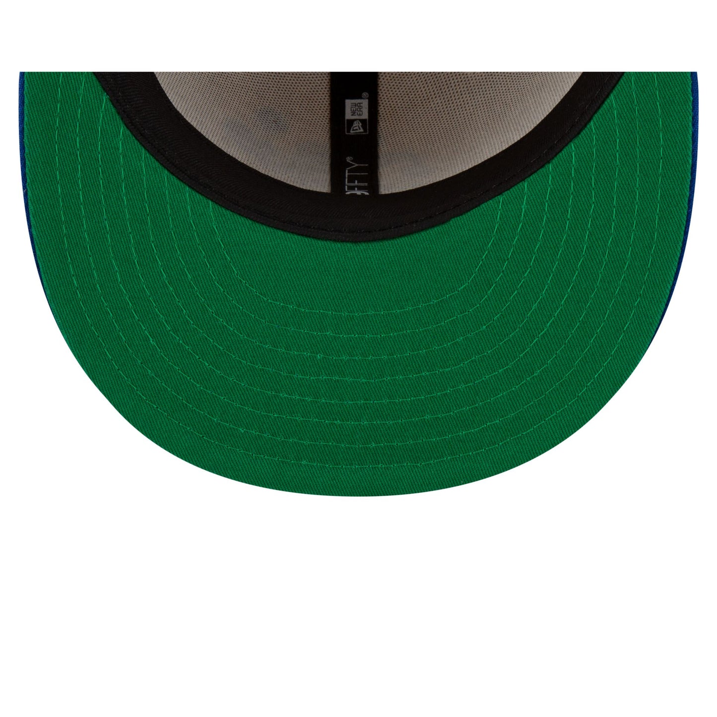 The Los Angeles Dodgers Mascot 59FIFTY Fitted Cap features an embroidered Dodgers mascot at the front panels with a matching MLB Batterman logo at the rear. Additional details include a Dodger Stadium patch at the right-wear side and a green undervisor.