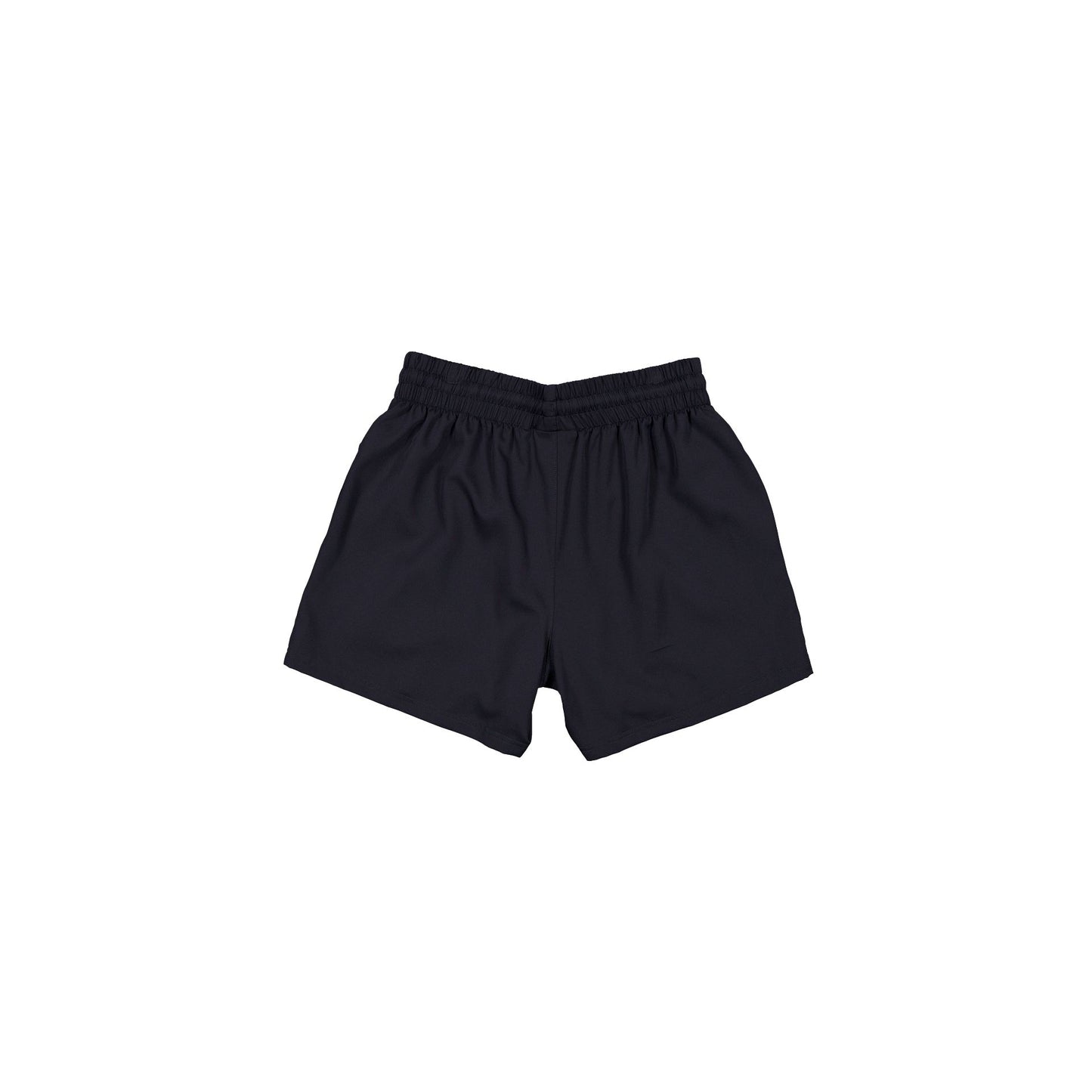 The Los Angeles Dodgers Navy League Essentials Shorts feature a screen-printed Dodgers logo at the front right leg with pockets and adjustable drawstrings.