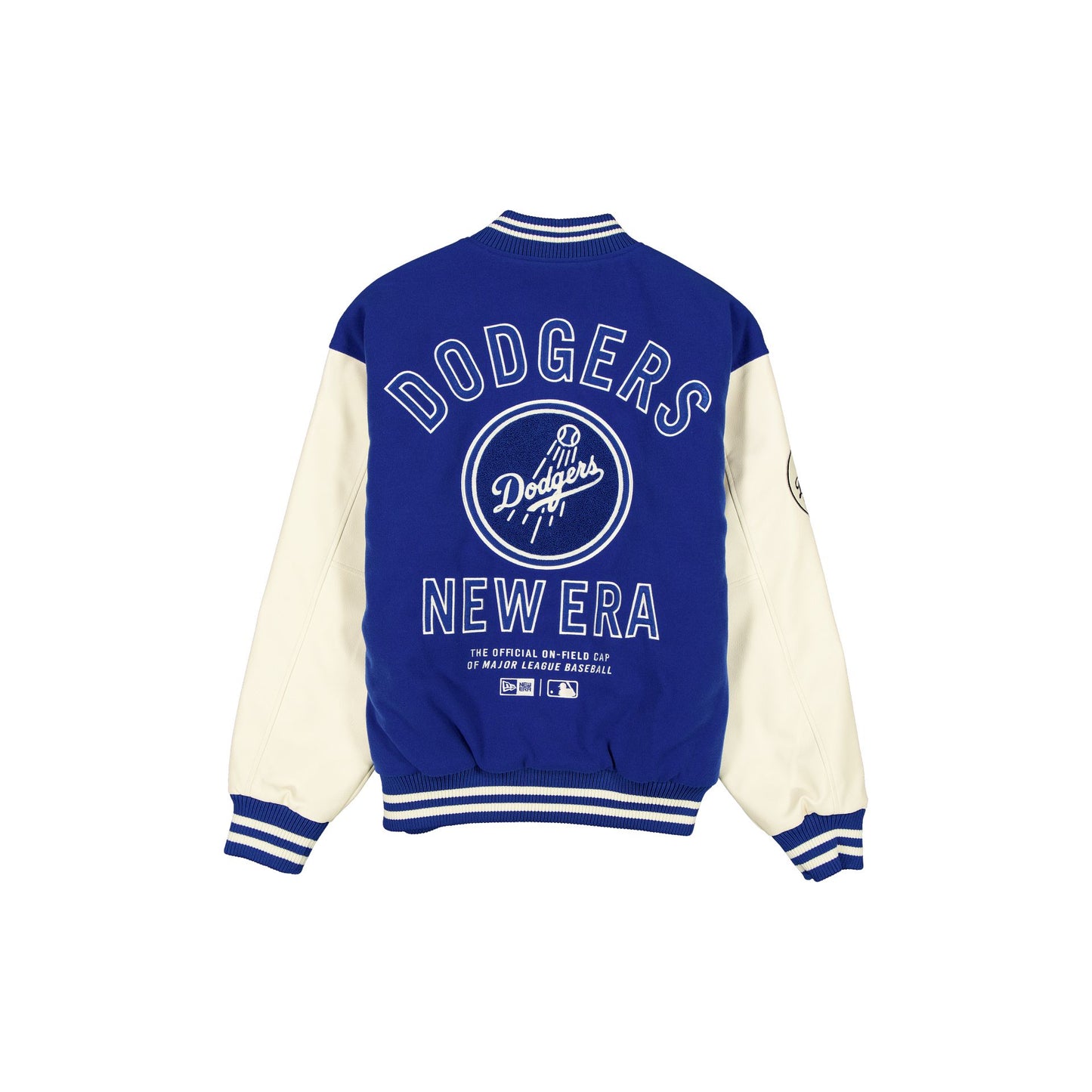 The Los Angeles Dodgers Patched Blue Varsity Jacket features a chenille applique Dodgers logo at the left chest, a snap-button closure at the front, and a team script at the side slit pockets. Additional details include a Dodgers logo patch at the right sleeve with a matching team wordmark and logo above New Era Cap wordmark and MLB Batterman logo at the rear. The jacket features striped details at the banding on the sleeves and hem with an interior pocket at the left chest and a quilted insolation lining.
