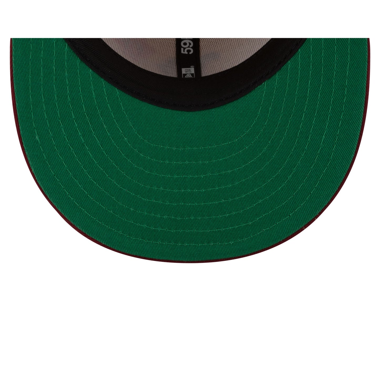 The Los Angeles Dodgers Puerto Rico City Elements 59FIFTY Fitted Cap features an embroidered Dodgers logo at the front panels with the national flower of Puerto Rico, the Flor de Maga (Thespesia grandiflora), embroidered throughout the cap. Additional details include a matching MLB Batterman logo at the rear and a green undervisor.