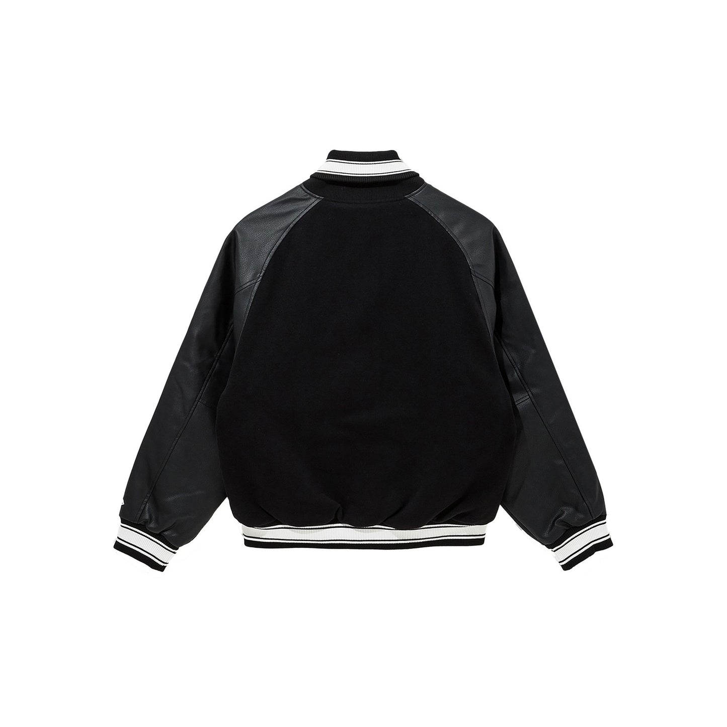 The Los Angeles Dodgers Raglan Black Varsity Jacket features an embroidered New Era Cap wordmark at the right chest with a chainstitched applique Dodgers logo at the left chest, a snap-button closure at the front, and a team script at the side slit pockets. Additional details include shoulderless raglan design with striped details at the banding on the sleeves and hem, a shawl-style collar, an interior pocket at the left chest, and a quilted insolation lining.
