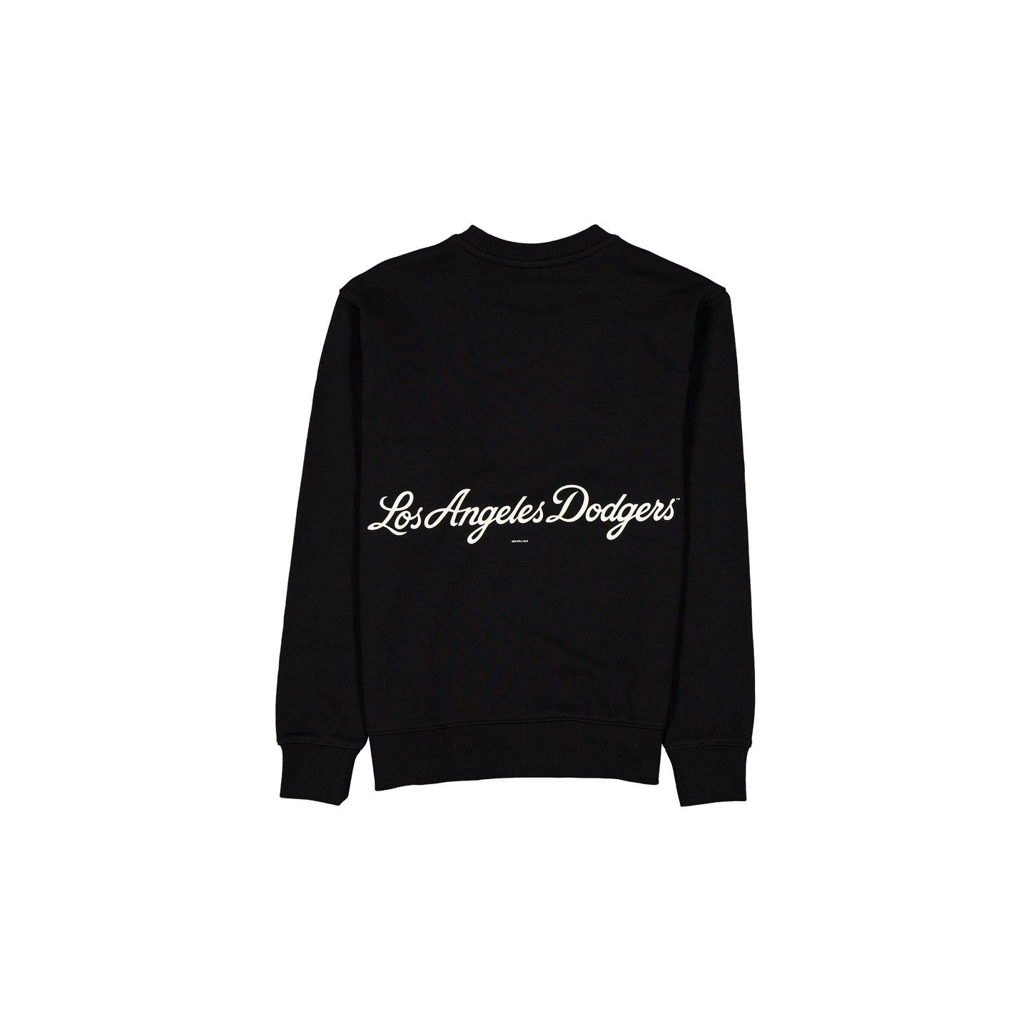 The Los Angeles Dodgers Relaxed Black Crewneck features a screen-printed Dodgers logo at the left chest and a script wordmark at the rear.