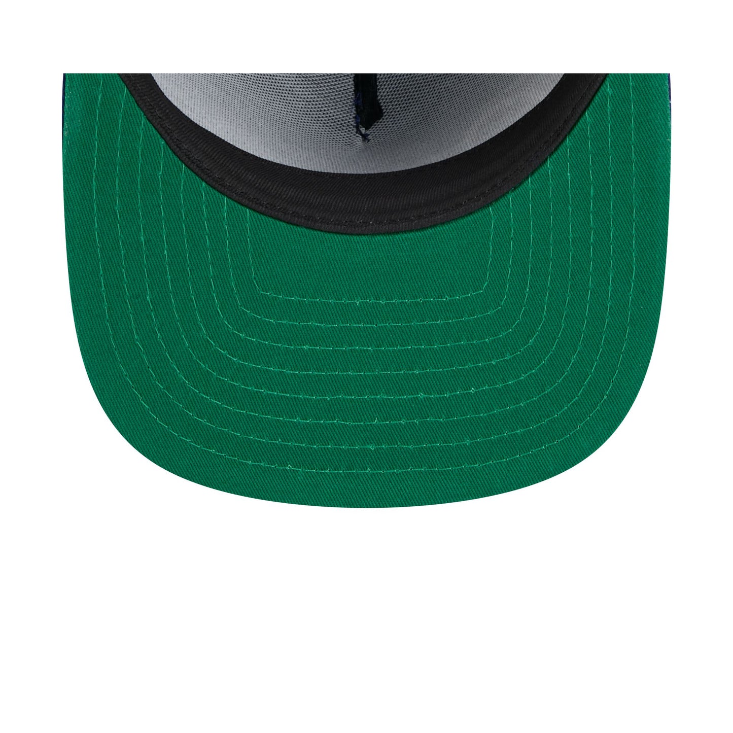 The Los Angeles Dodgers Shohei Ohtani 9FIFTY A-Frame Snapback features the player's name embroidered at the front panels with a team pin at the top left panel. Additional details include a snapback closure at the rear and a green undervisor.