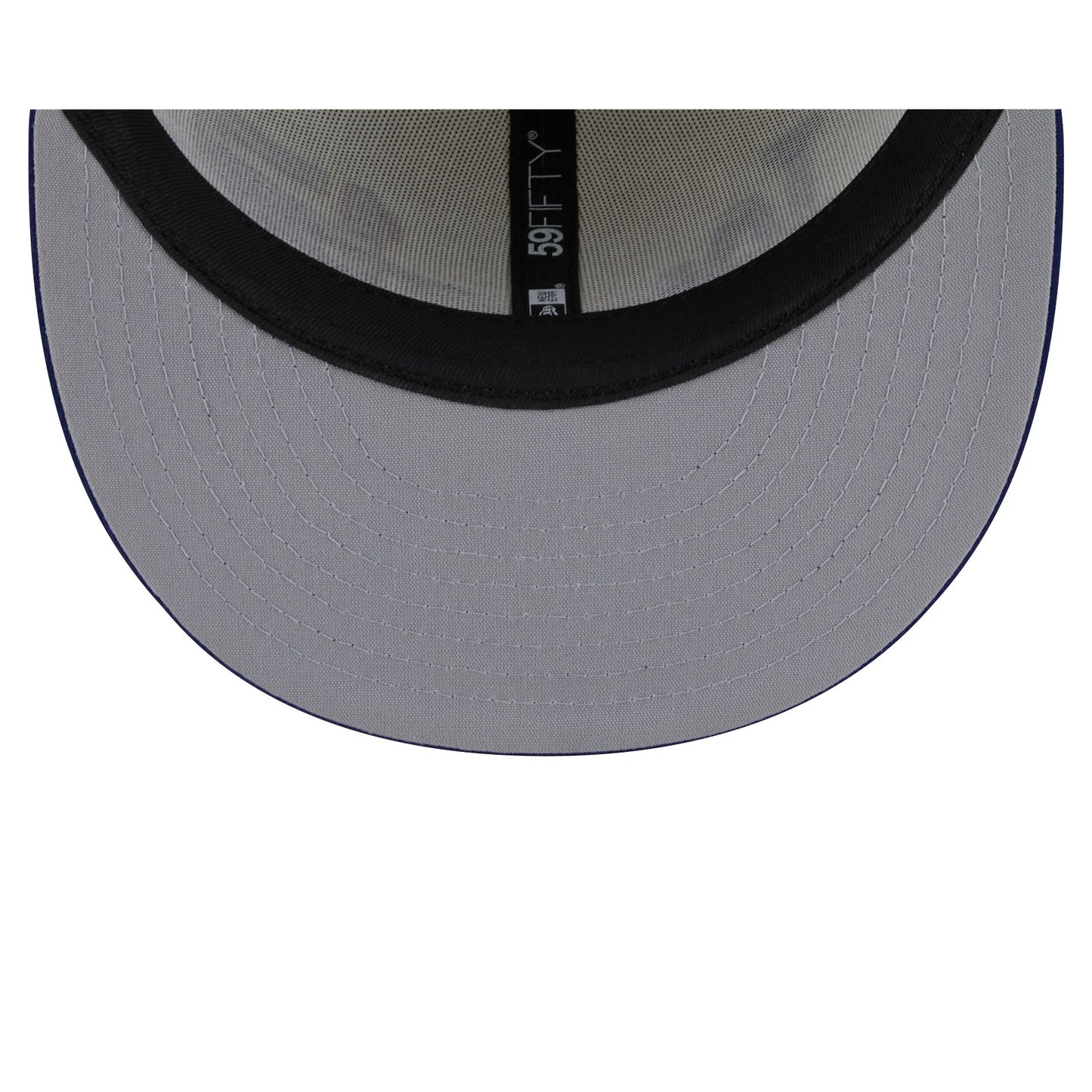 The Los Angeles Dodgers Shohei Ohtani Chrome White 59FIFTY Fitted Cap features an embroidered Dodgers logo at the right panel and the player's signature and number at the right. Additional details include an MLB Batterman logo at the rear and a gray undervisor.