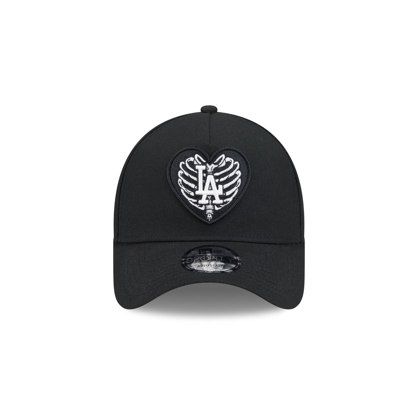 The Los Angeles Dodgers Skeletal Heart 9FORTY A-Frame Snapback features an embroidered Dodgers heart patch at the front with a snapback closure at the rear and a gray undervisor.