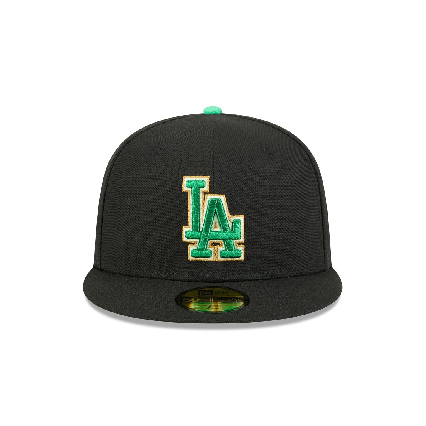 The Los Angeles Dodgers St. Patrick's Day 2026 59FIFTY Fitted Cap features a green and gold embroidered Dodgers logo at the front panels with a matching MLB Batterman logo at the rear and a mini shamrock at the top right. Additional details include a team wordmark over a metallic green shamrock baseball diamond patch at the right-wear side with a green plaid interior fabrication at the front panels.