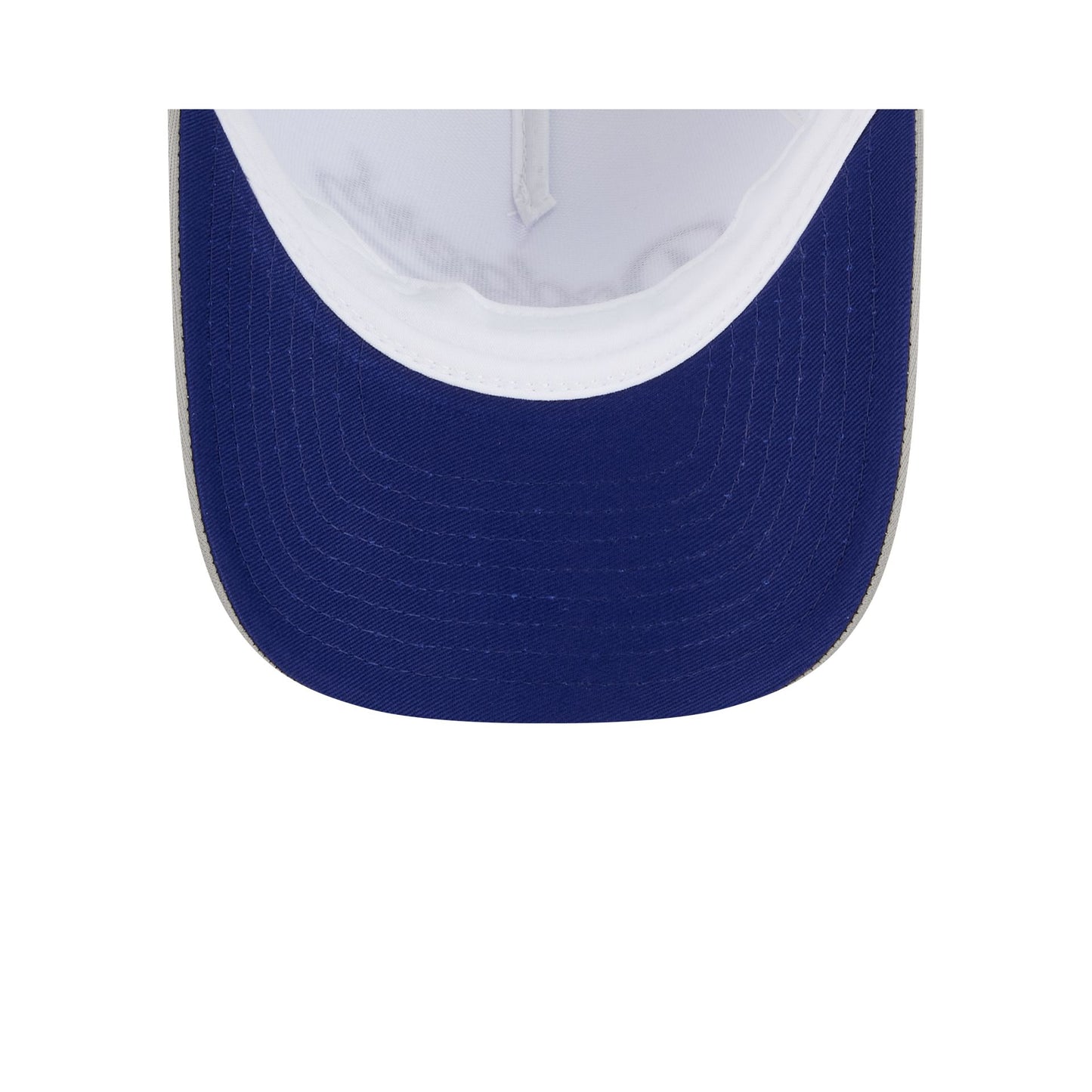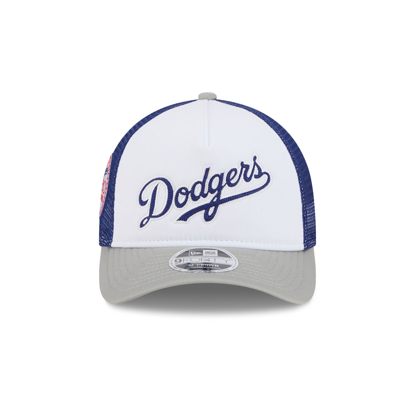 The Los Angeles Dodgers Summer Derby 9FORTY M-Crown A-Frame Snapback features an embroidered Dodgers wordmark at the front panel with a 1980 All-Star Game patch at the right-wear side. Additional details include a team logo above an adjustable snapback closure at the rear with a gray visor and a blue undervisor.