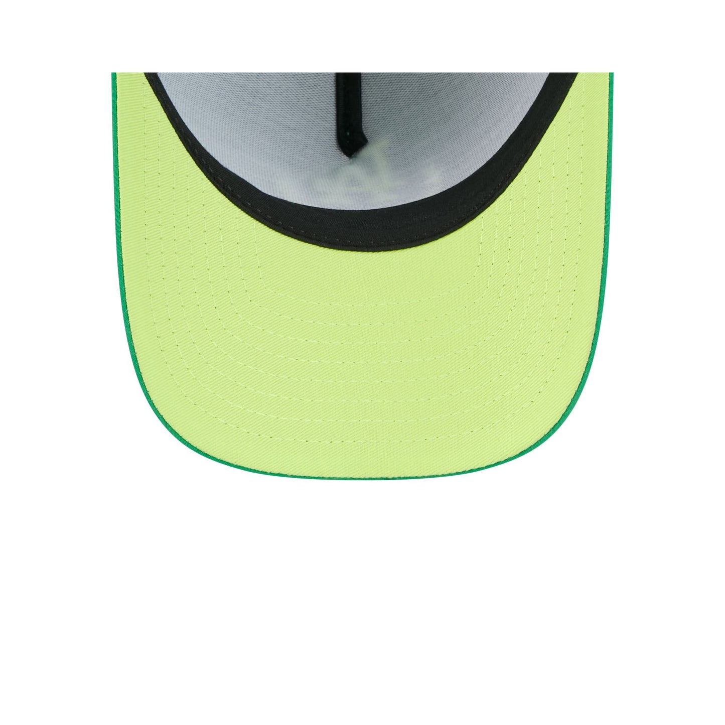 The Los Angeles Dodgers Tee Time 9FORTY M-Crown A-Frame Snapback features an embroidered Dodgers golf logo at the front panels with a snapback closure at the rear and a neon green undervisor.