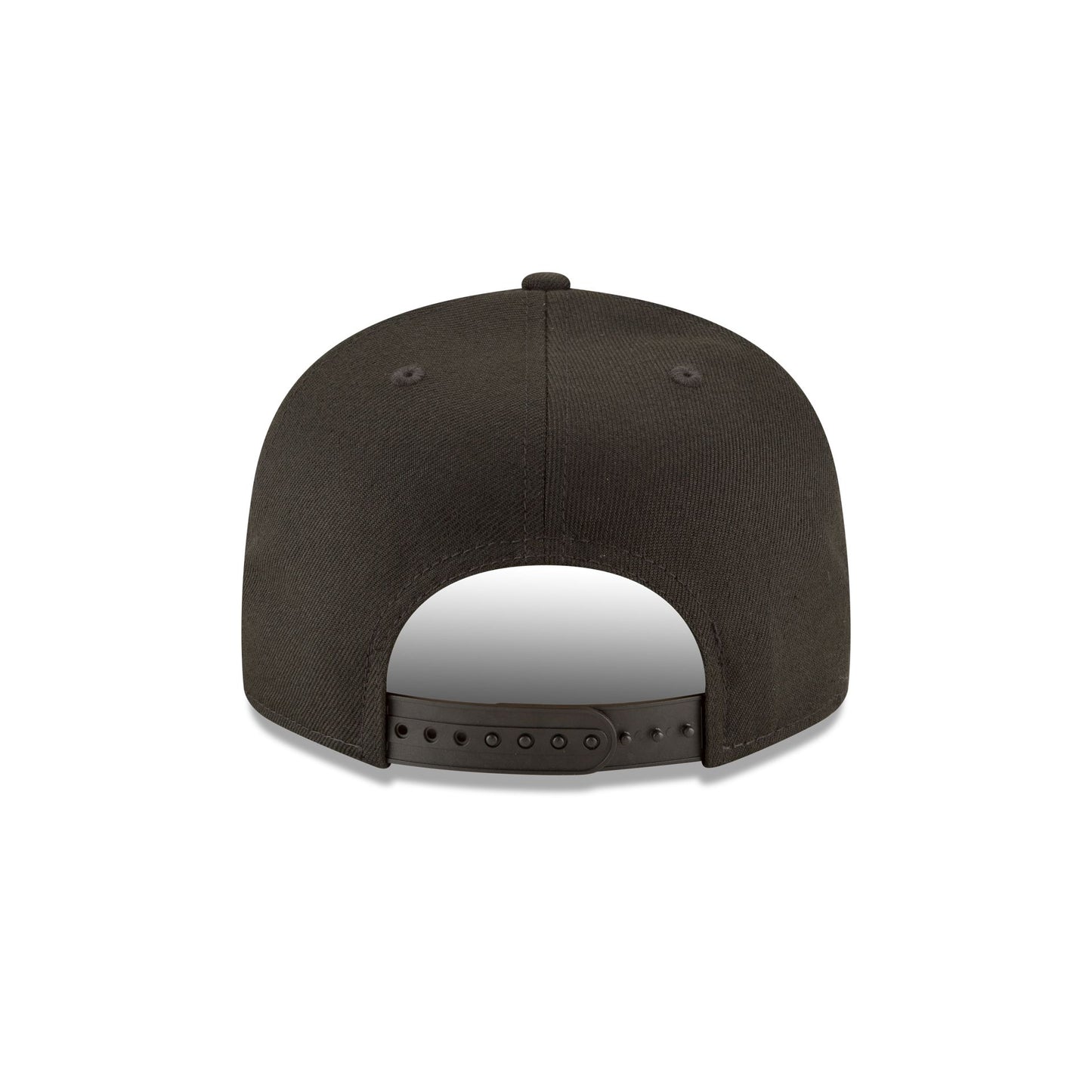 The Los Angeles Dodgers World Series Champions Black on Black 9FIFTY Snapback features an embroidered Dodgers logo at the front panels with a 2024 World Series Champions patch at the right-wear side and a snapback closure at the rear.