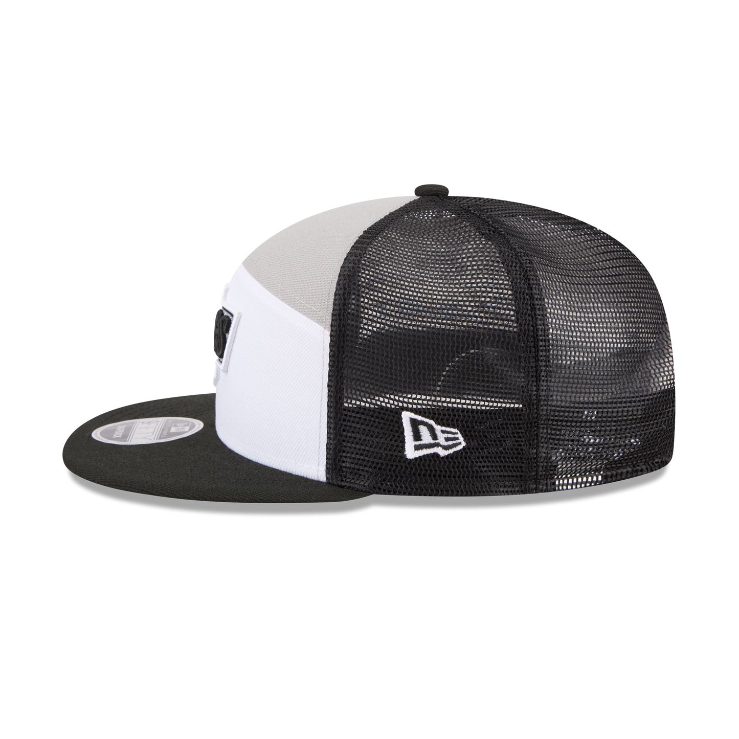 The Los Angeles Kings Block Split Panel 9FIFTY Trucker features an embroidered Kings logo at the front panels with a split crown construction. Additional details include an adjustable snapback closure at a mesh rear and a gray undervisor.