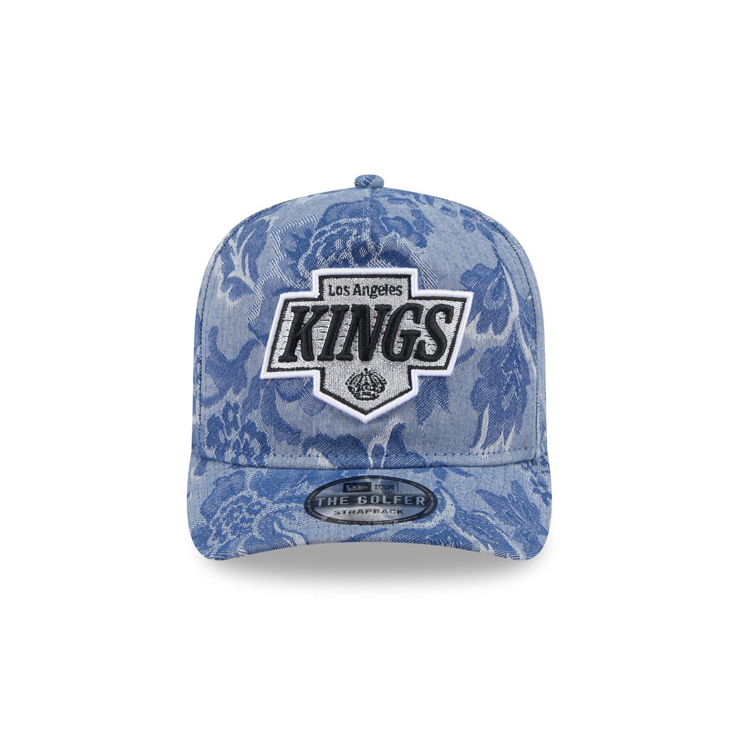 The Los Angeles Kings Denim Jacquard Golfer features an embroidered Kings logo at the front panels against a specialty Japanese milled gobline chambray fabrication from Three Looms Japan Fabrics throughout the cap. Additional details include a team wordmark at the right wear side, an adjustable D-Ring closure at the rear, and a green undervisor.