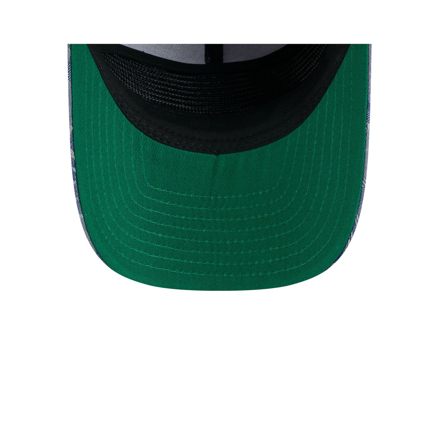 The Los Angeles Kings Denim Jacquard Golfer features an embroidered Kings logo at the front panels against a specialty Japanese milled gobline chambray fabrication from Three Looms Japan Fabrics throughout the cap. Additional details include a team wordmark at the right wear side, an adjustable D-Ring closure at the rear, and a green undervisor.