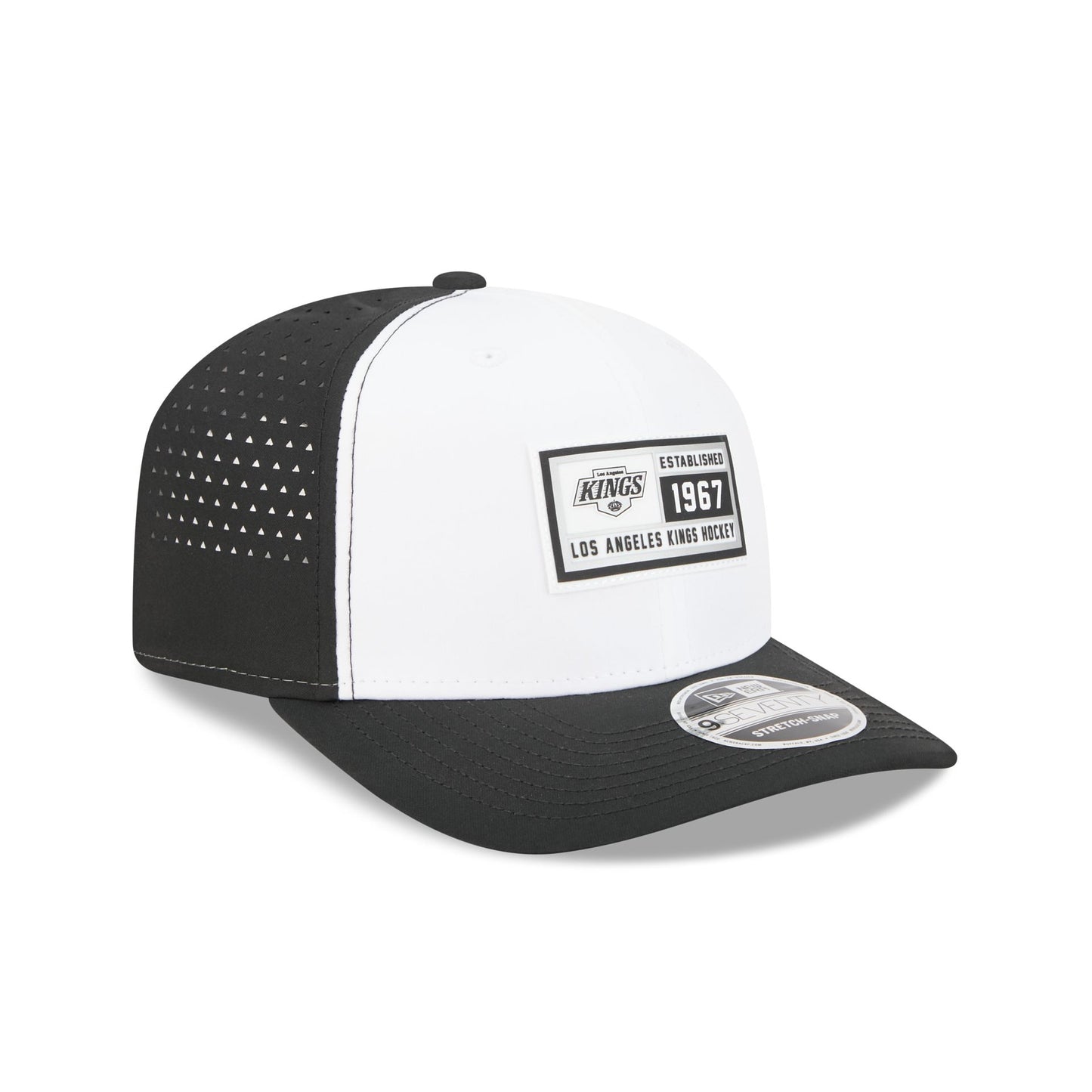 The Los Angeles Kings Est. Patch 9SEVENTY Stretch-Snap features a woven silicone Kings establishment patch at the front panels with a slant-snap closure at a performance mesh rear and a gray undervisor.