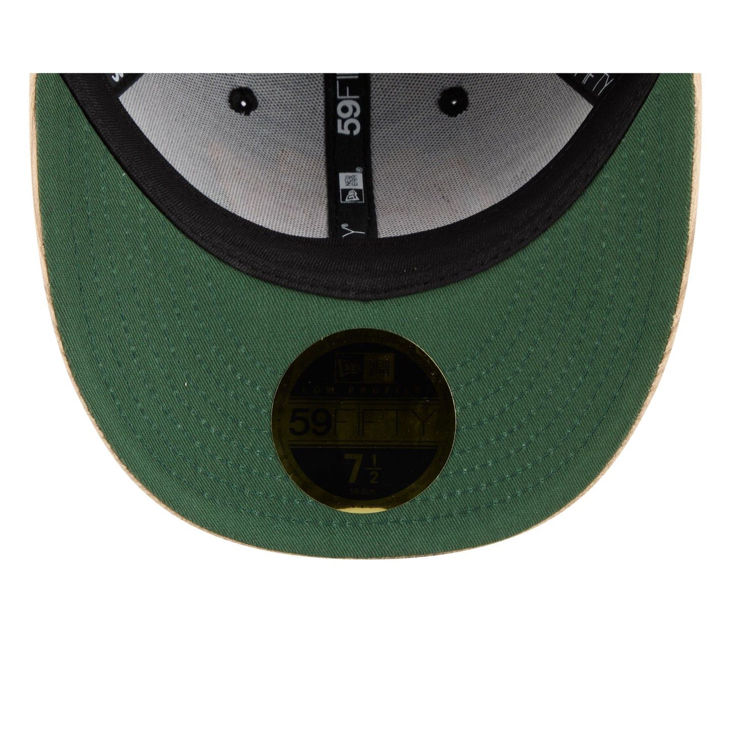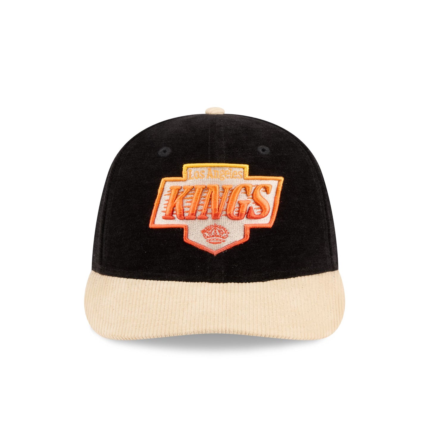 The Los Angeles Kings Fall Velvet Low Profile 59FIFTY Fitted Cap features an embroidered Kings fall gradient logo at the front panels against a velvet fabrication throughout. Additional details include an antique brass leather stitch down city plate at the right-wear side, a matching NHL Shield logo at the rear, and a green undervisor.