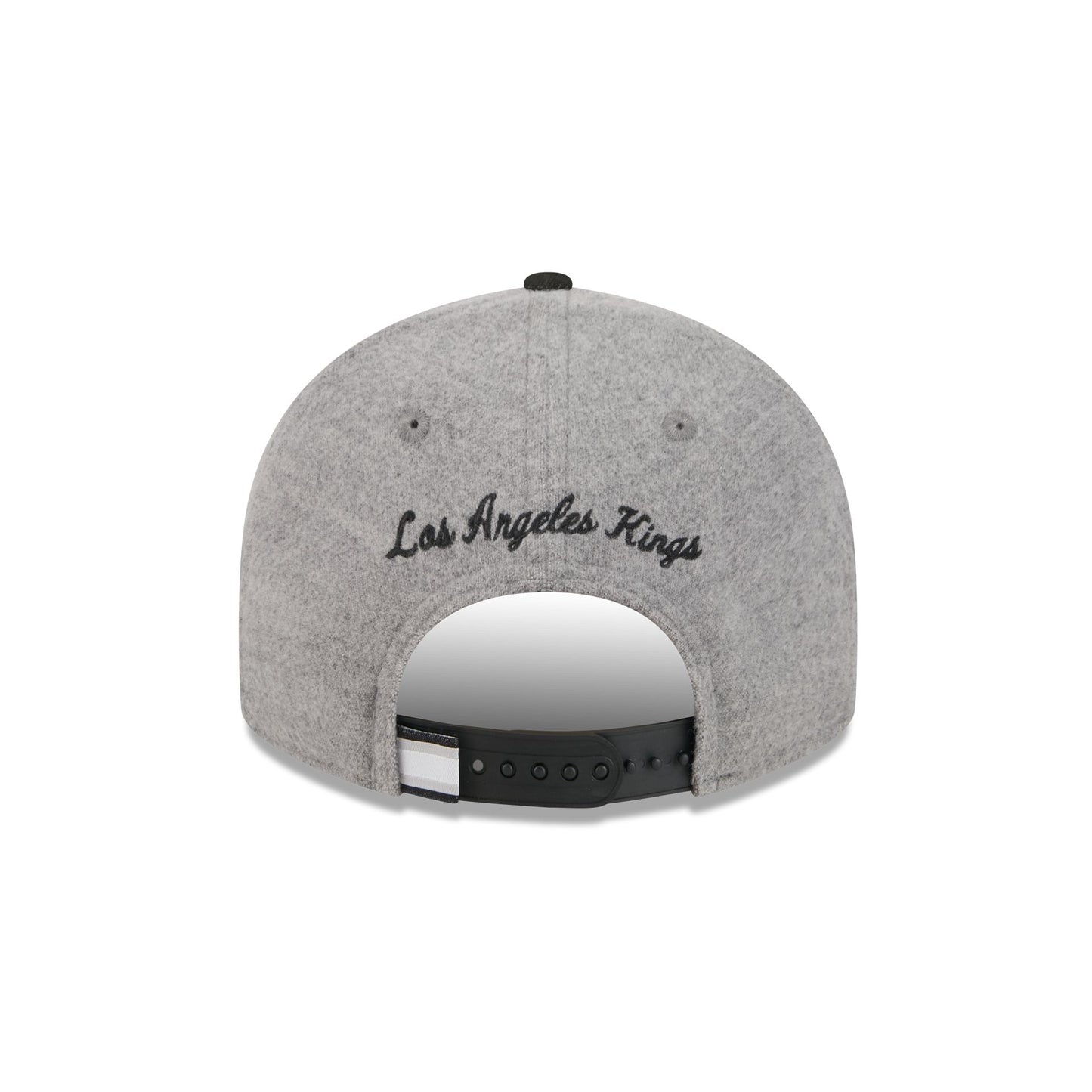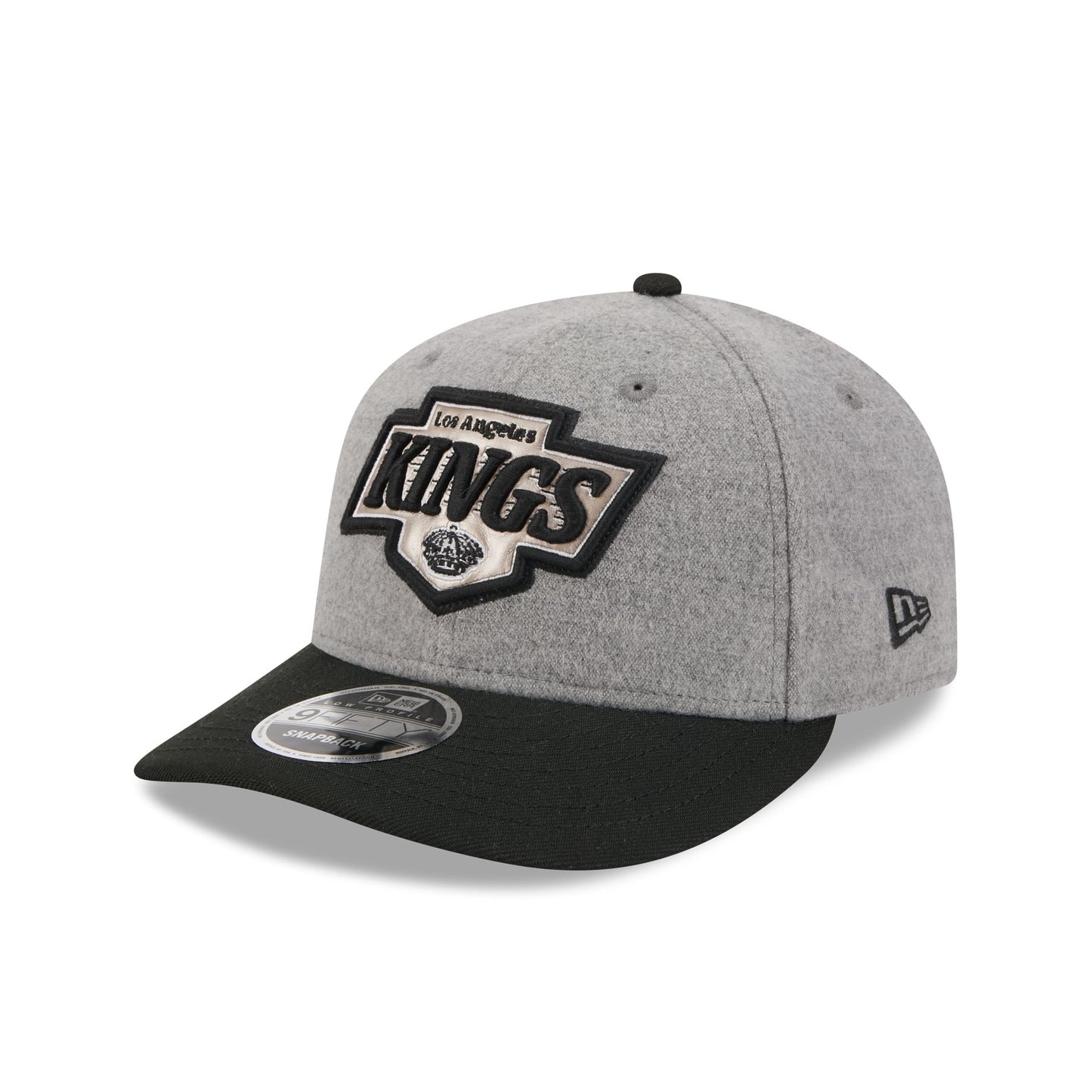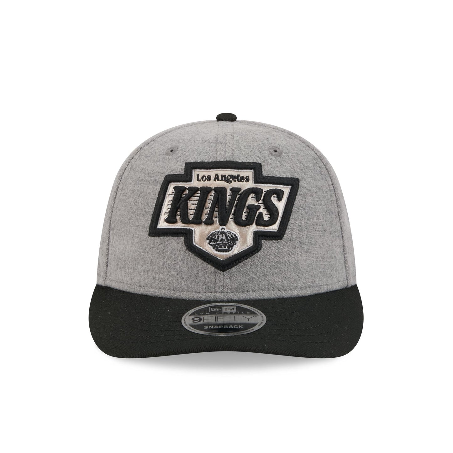 The Los Angeles Kings Heather Gray Wool Low Profile 9FIFTY snapback features a faux leather applique Kings logo at the front panels against a wool fabrication throughout the cap. Additional details include a conference patch at the right-wear side, an NHL pin at the front, and a script wordmark above an adjustable snapback closure at the rear.