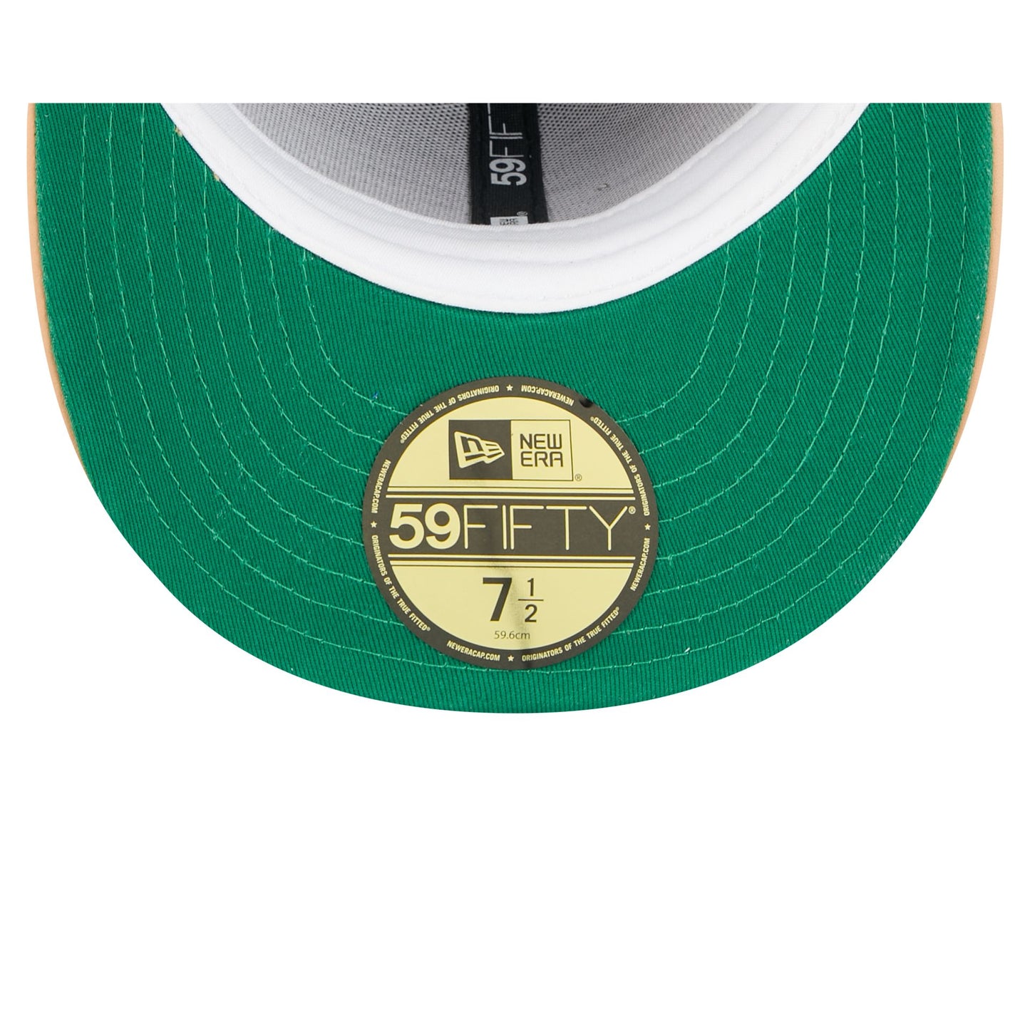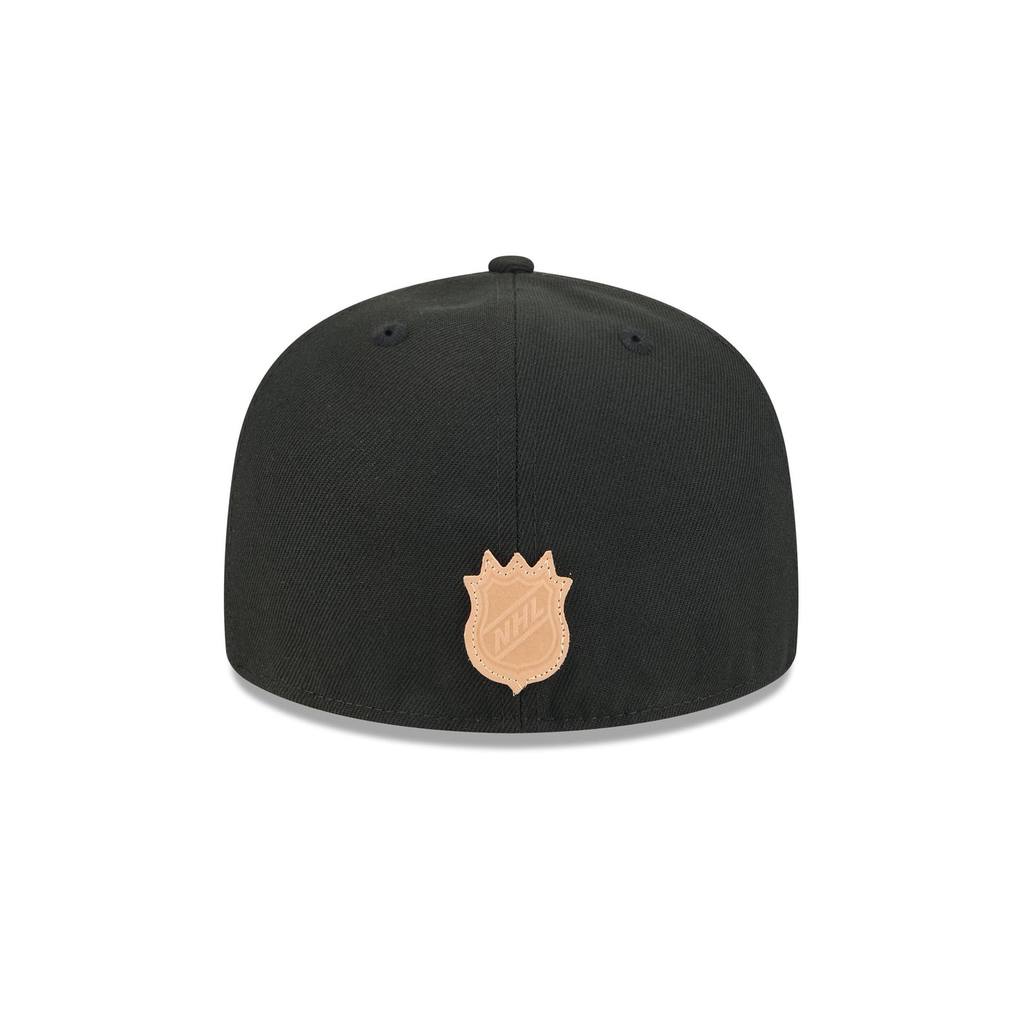 The Los Angeles Kings Leather Visor 59FIFTY Fitted Cap features an embroidered Kings logo at the front panels with a cream leather visor. Additional details include an NHL Shield logo at the rear and a green undervisor with leather accents throughout.