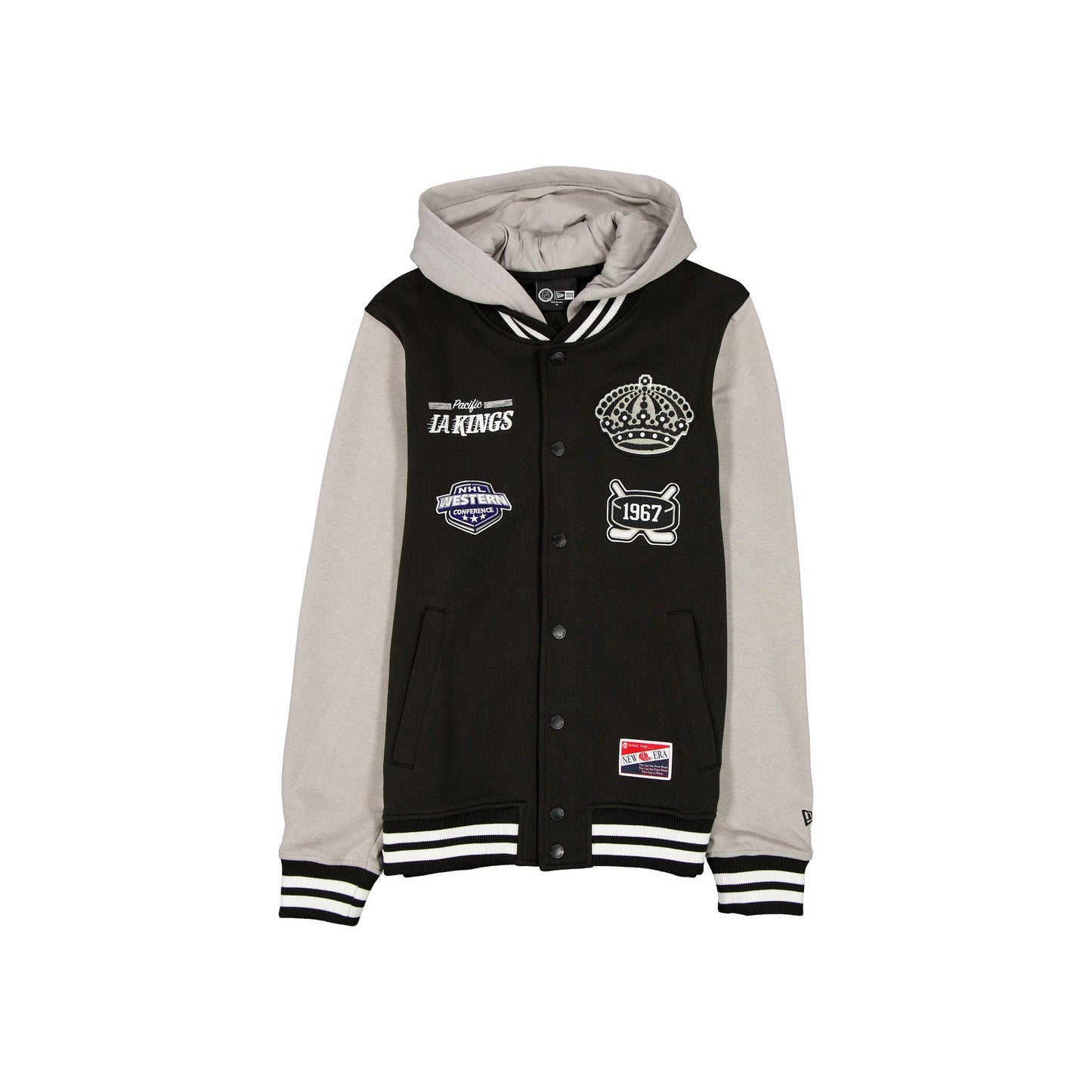 The Los Angeles Kings Throwback Black Jacket features an embroidered chenille applique Kings logo at the left chest with team patches at the front. Additional details include a snap button closure, pockets, and a hood.