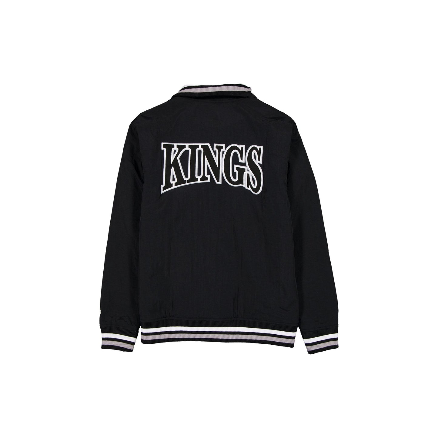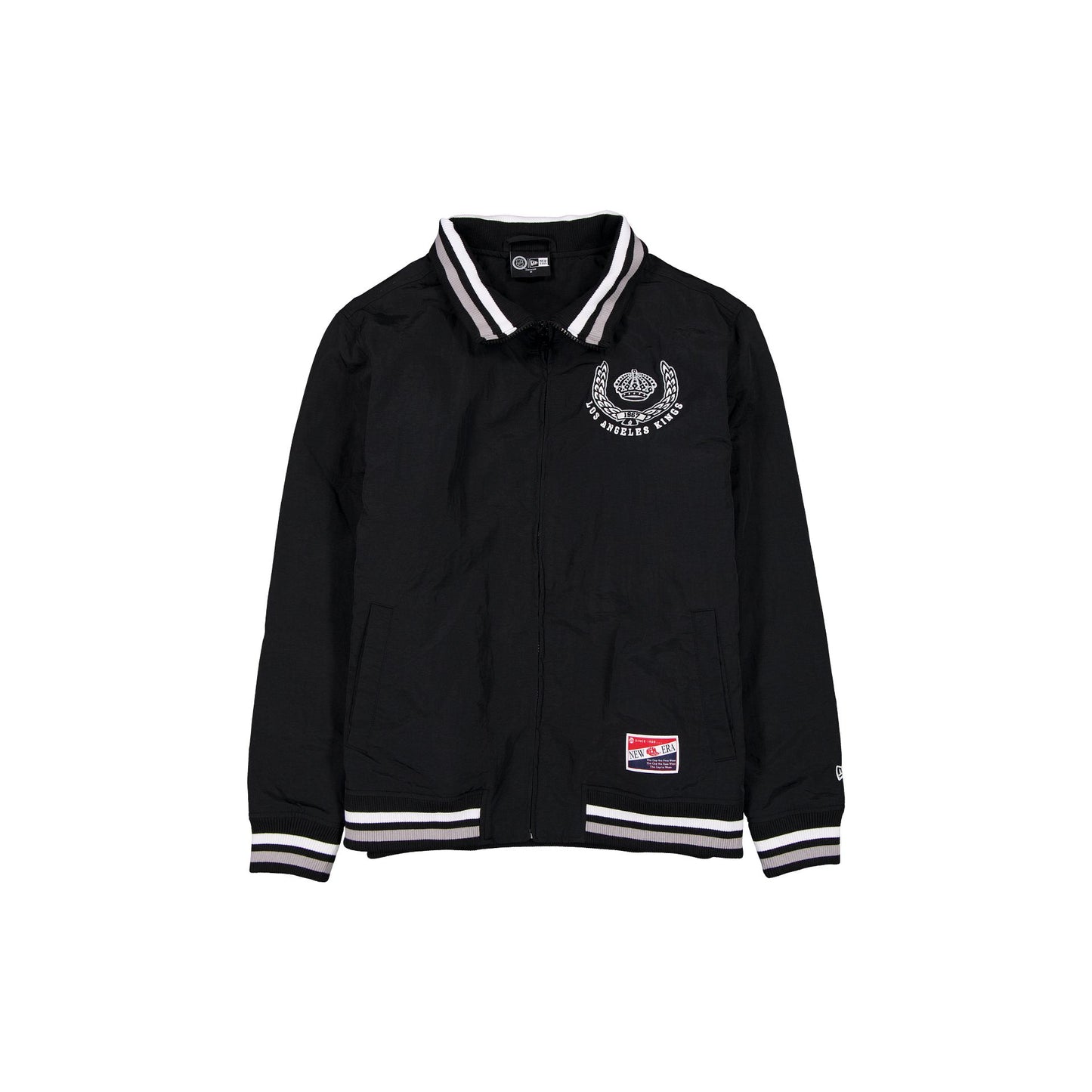 The Los Angeles Kings Throwback Laurel Jacket features an embroidered Kings laurel graphic at the left chest with a wordmark at the rear. Additional details include a woven New Era jock tag at the left hip, front pockets, a zipper closure, and a quilted lining.