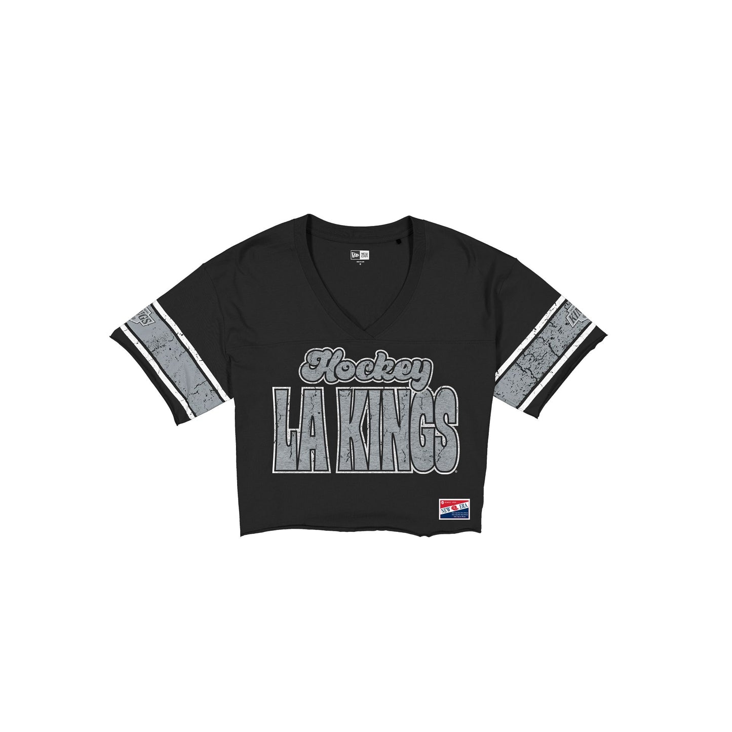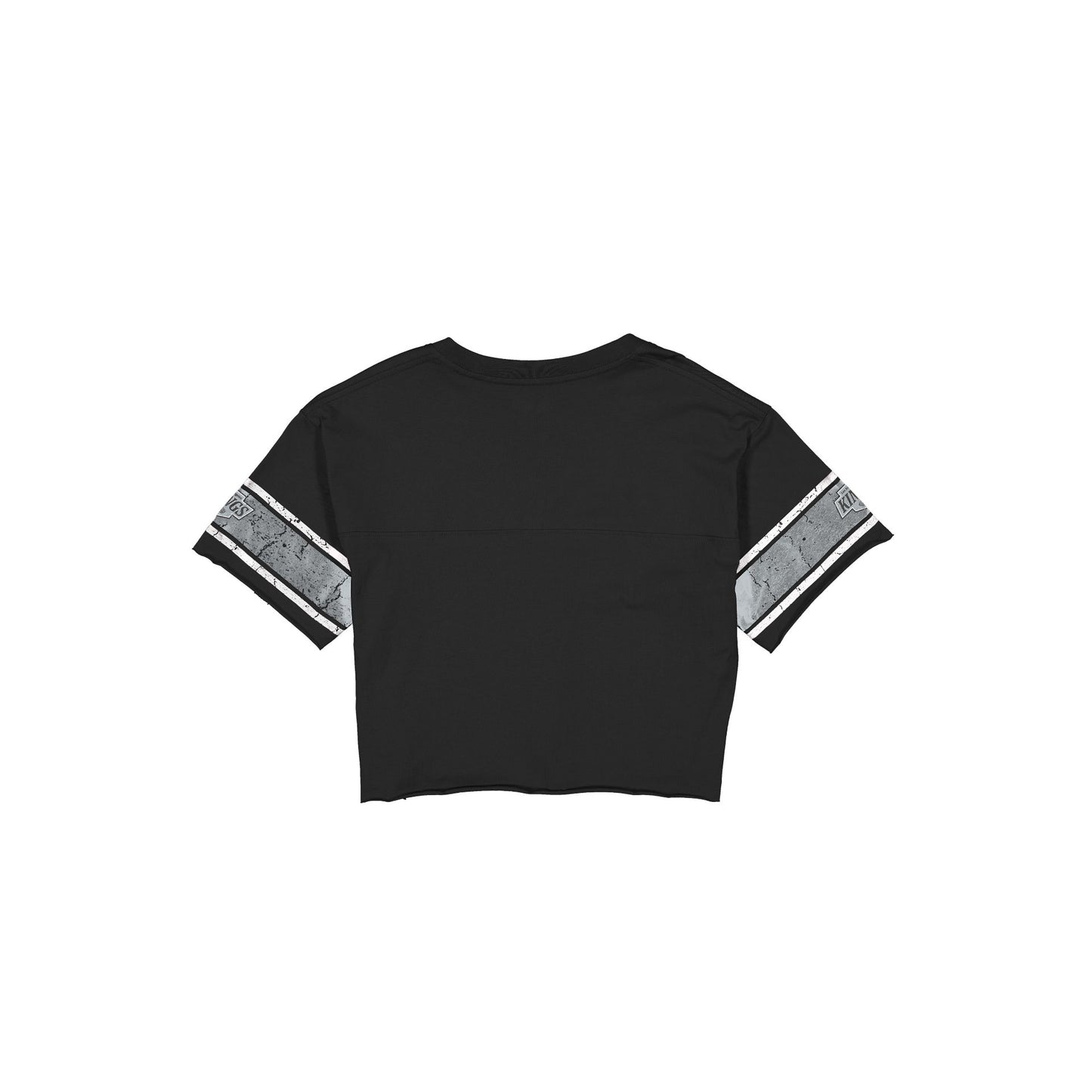 The Los Angeles Kings Throwback Women's Cropped T-Shirt features a screen-printed Kings graphic at the front with a New Era jock tag at the left hip.
