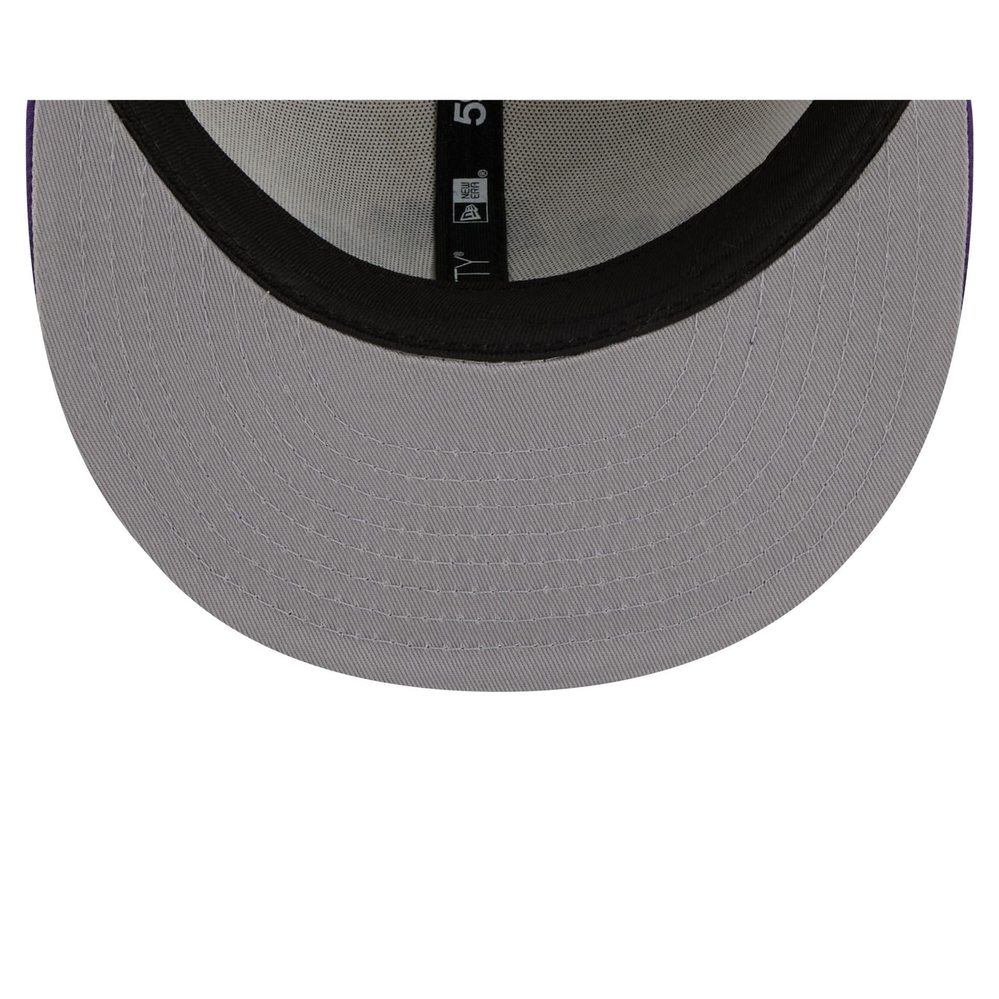 The Los Angeles Lakers 2025 City Edition Chrome White Corduroy 59FIFTY Fitted Cap features an embroidered Lakers City Edition logo at the front panels with a City Edition jock tag stitched at the right-wear side. Additional details include a corduroy fabrication, the NBA Logoman at the rear, and a gray undervisor.