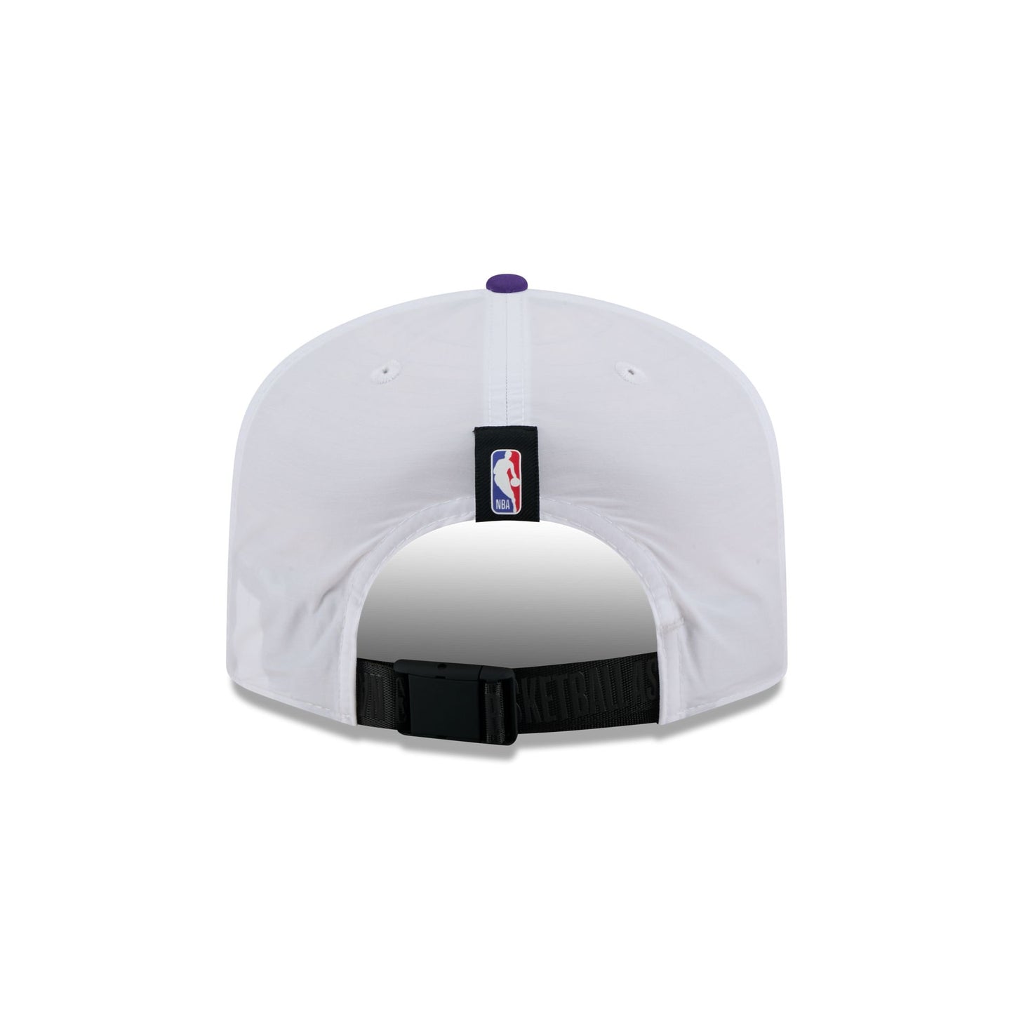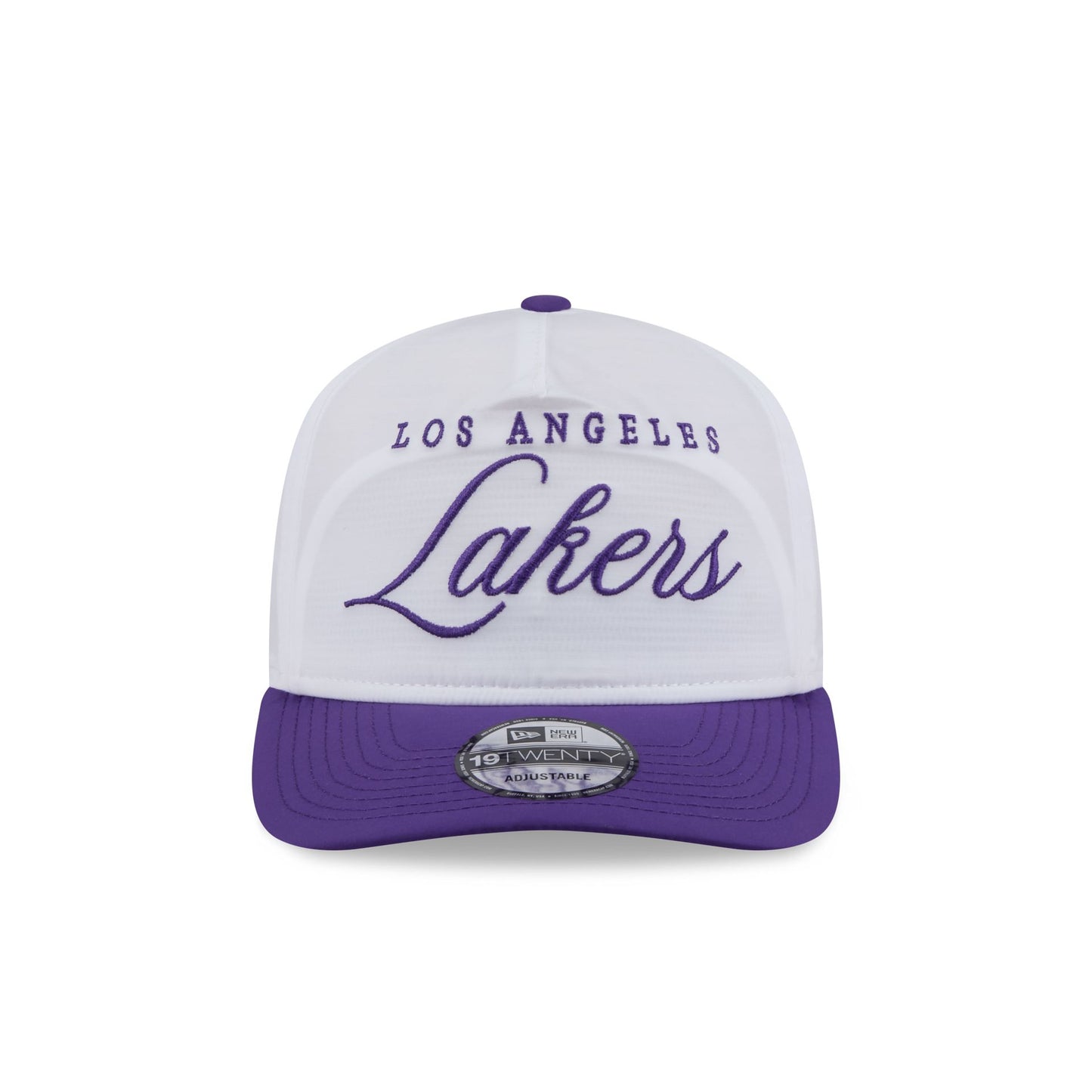 The Los Angeles Lakers 2025 Draft 19TWENTY Adjustable Cap features an embroidered Lakers script wordmark at the front panels with a team logo at the right-wear side. Additional details include a woven silicone NBA Logoman patch above an adjustable buckle closure at the rear and a gray undervisor. The strap features a National Basketball Association gel print wordmark.