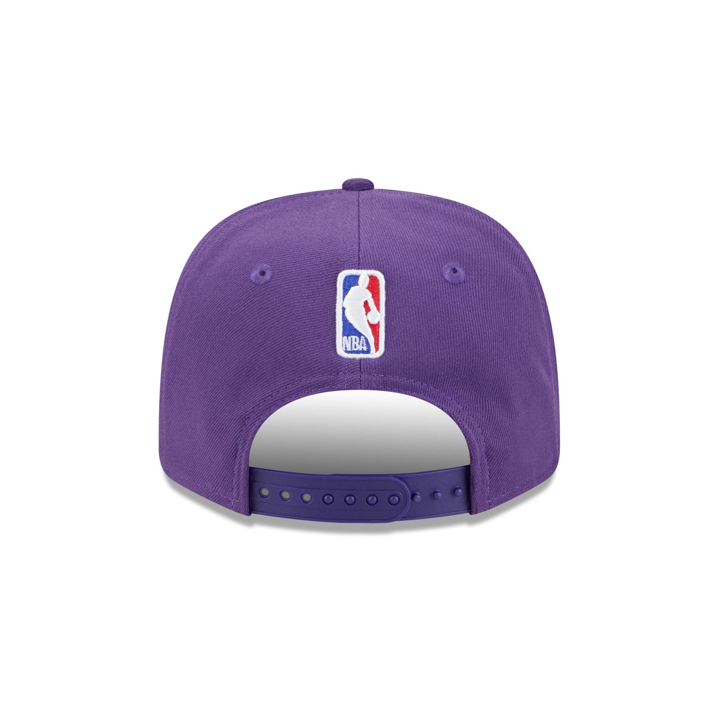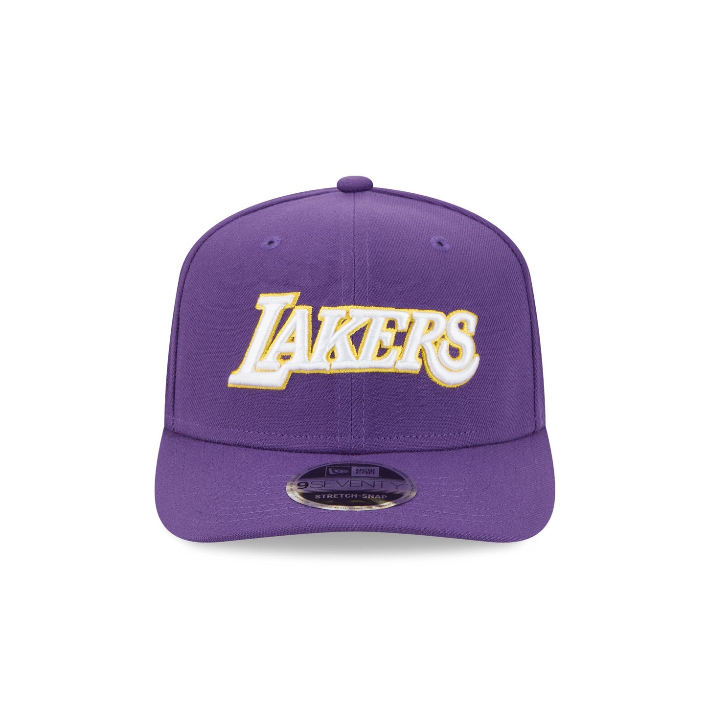The Los Angeles Lakers 2025 Statement Edition 9SEVENTY Stretch-Snap features an embroidered Lakers Statement Edition logo at the front panels with a logo at the right-wear side. Additional details include the NBA Logoman above an adjustable stretch-snap closure at the rear and a gray undervisor.