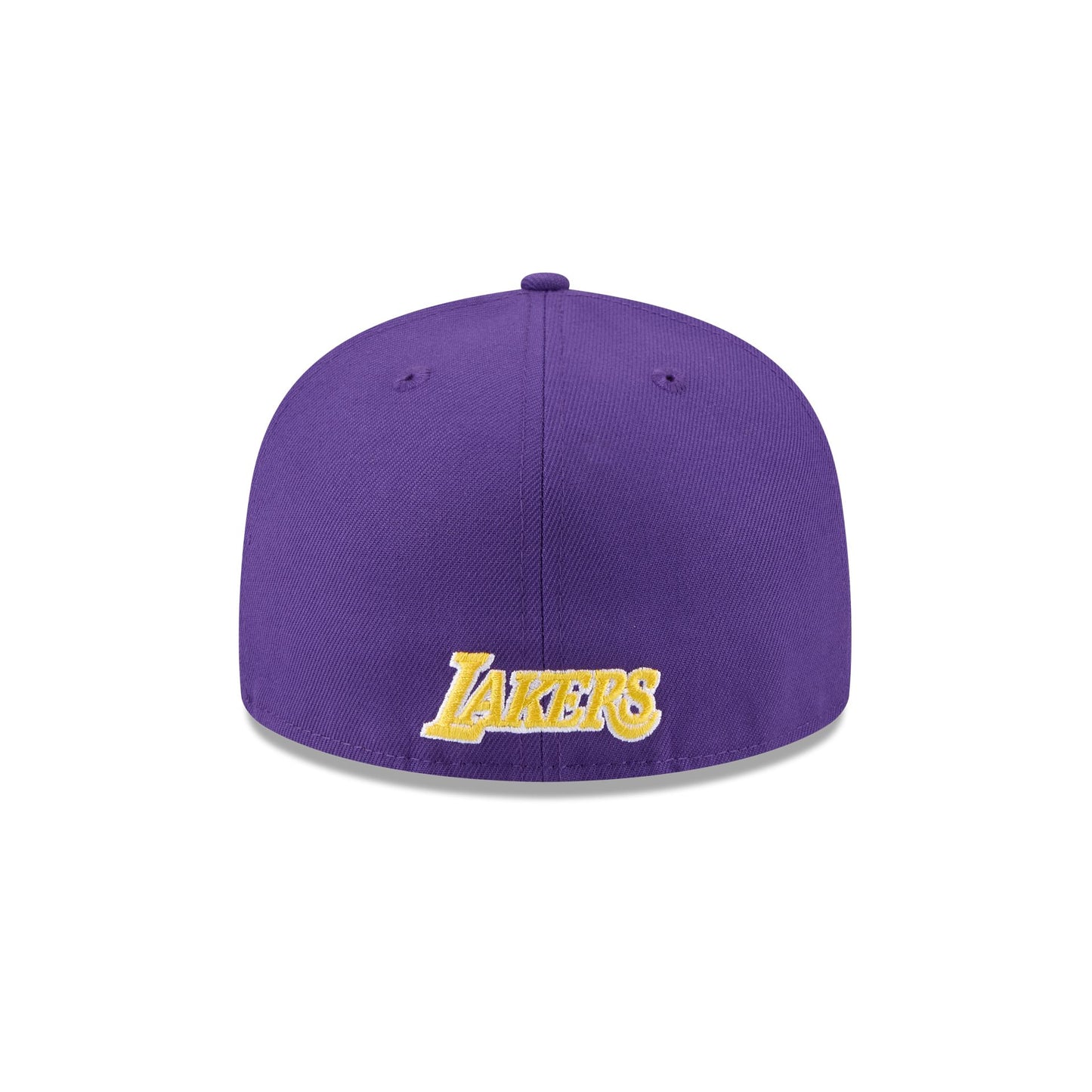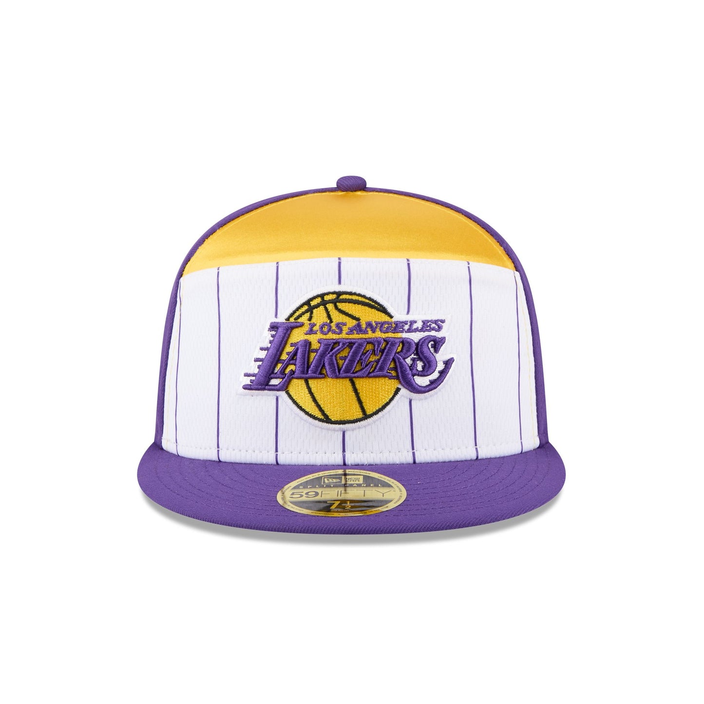 The Los Angeles Lakers 2025 Tip-Off Split Panel 59FIFTY Fitted Cap features an embroidered Lakers logo at the front panels against a pinstripe jersey fabrication with the NBA Logoman at the right-wear side. Additional details include a team wordmark at the rear and a gray undervisor.