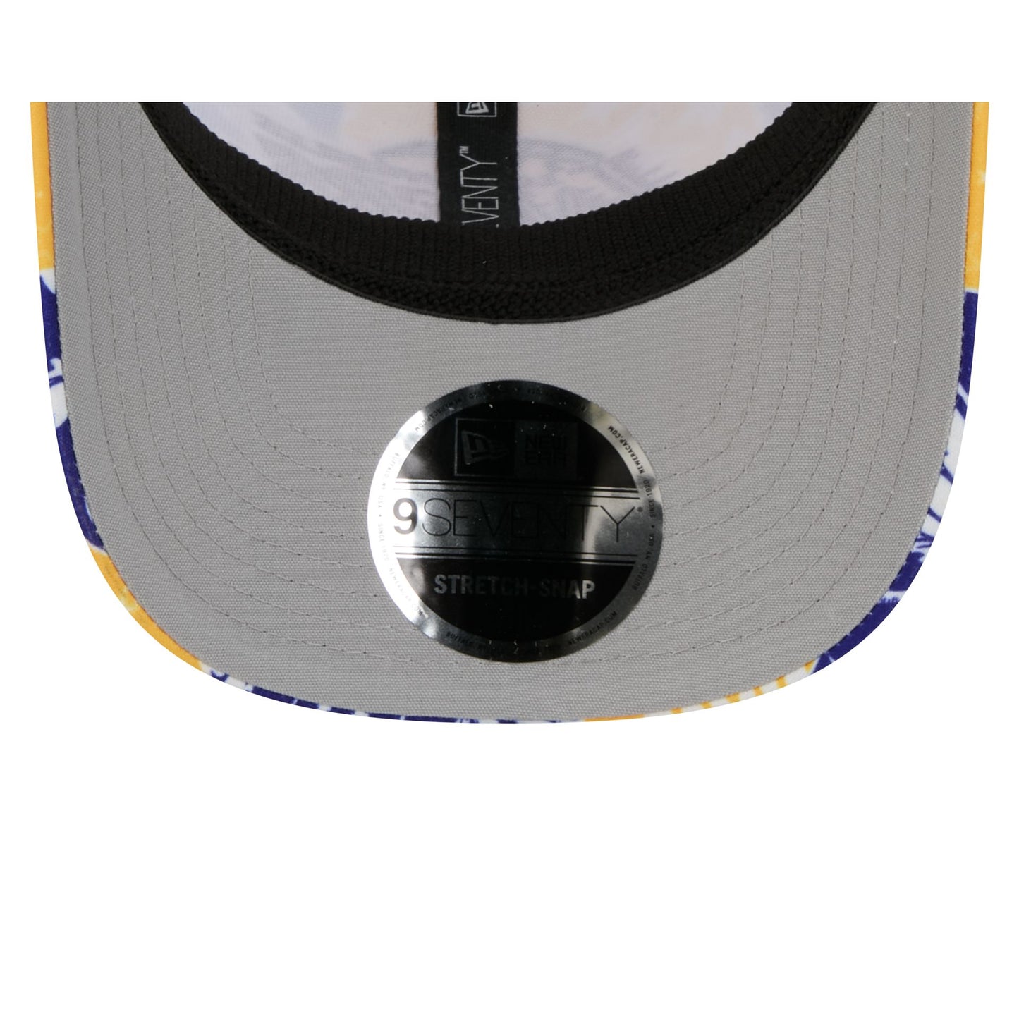 The Los Angeles Lakers 2026 All-Star Game Quilt 9SEVENTY Trucker features an embroidered Lakers logo at the front panels against a team quilt pattern. Additional details include an adjustable stretch-snap closure at a mesh rear and a gray undervisor.
