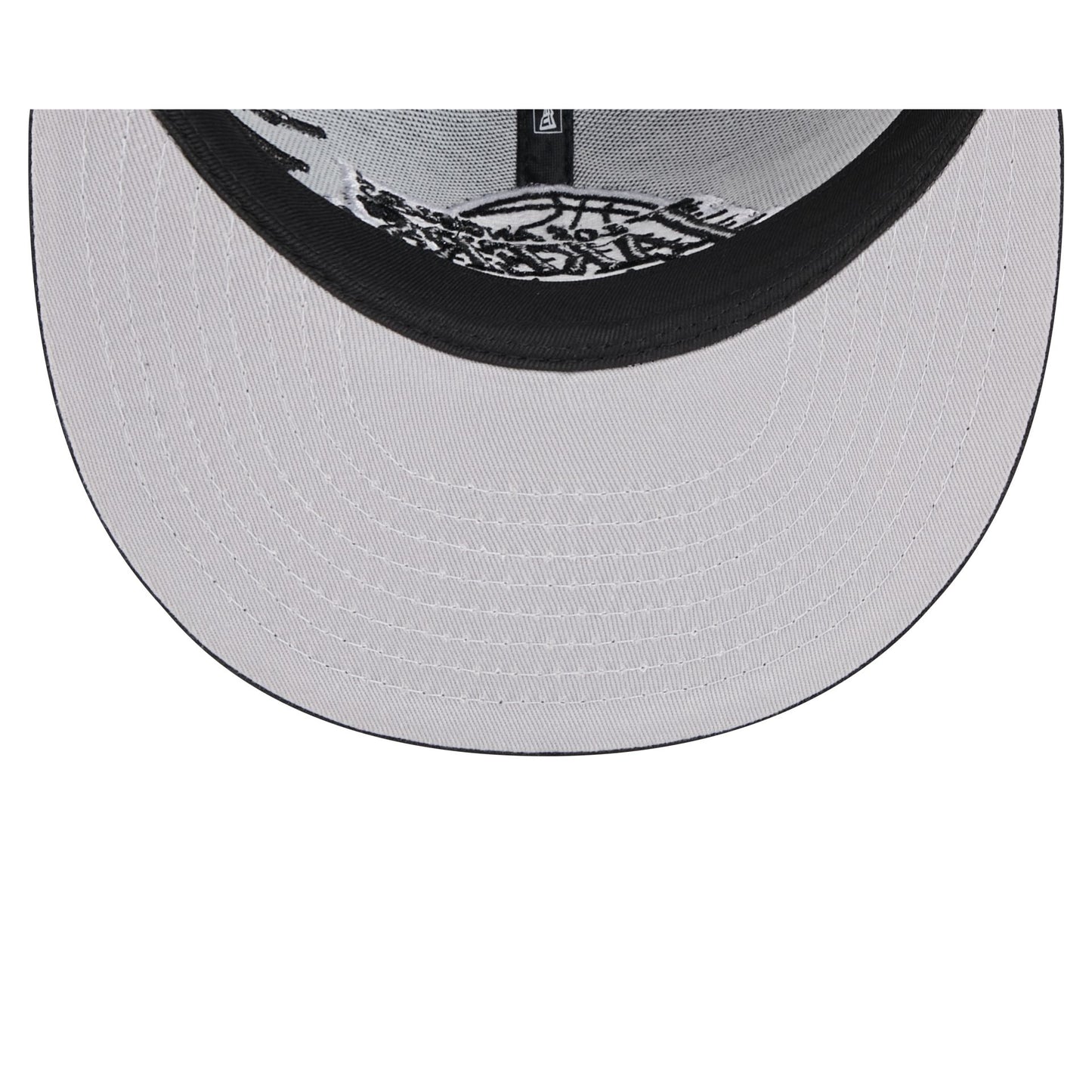 The Los Angeles Lakers City Art 9FIFTY Snapback features an embroidered Lakers black and white logo at the front panels and an embroidered city banner with art at the right-wear side. Additional details include a snapback closure at the rear and a gray undervisor.