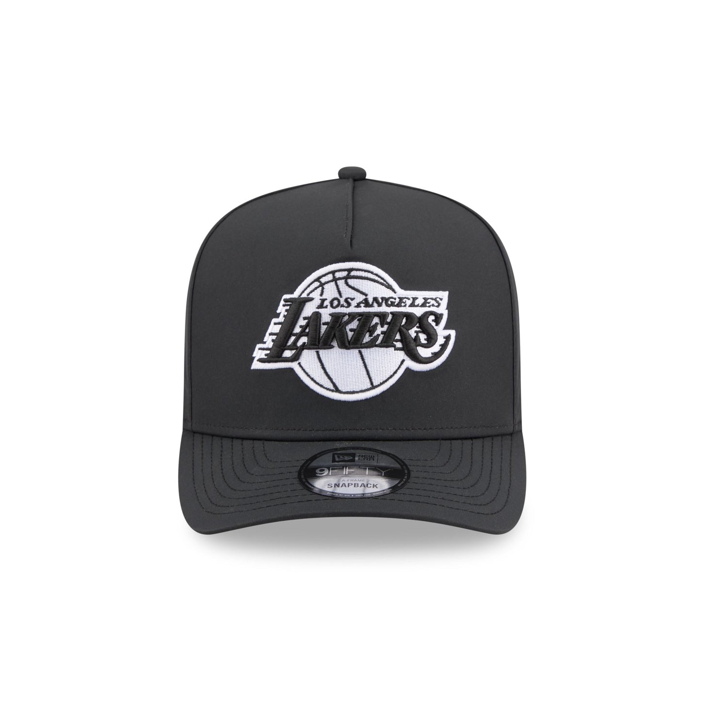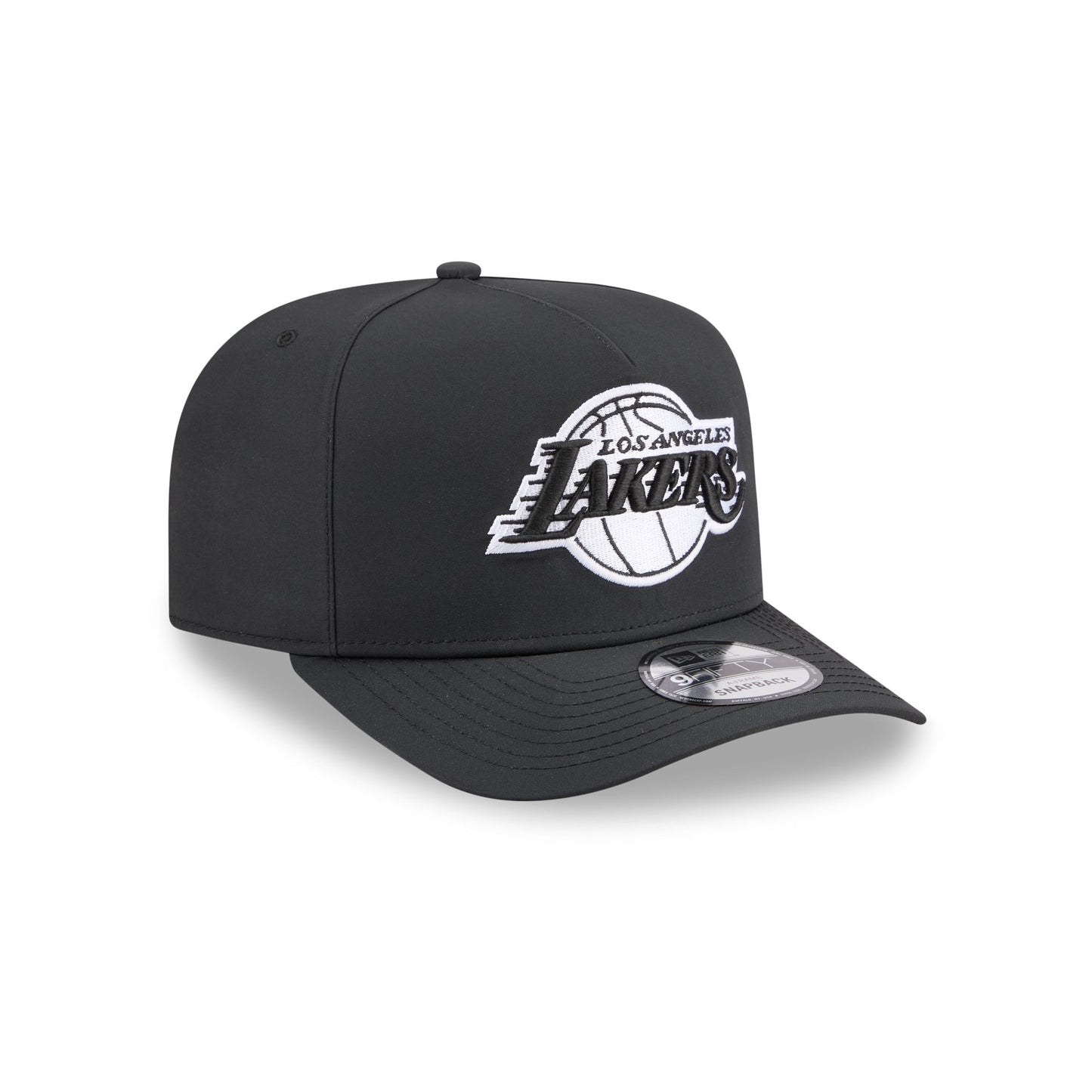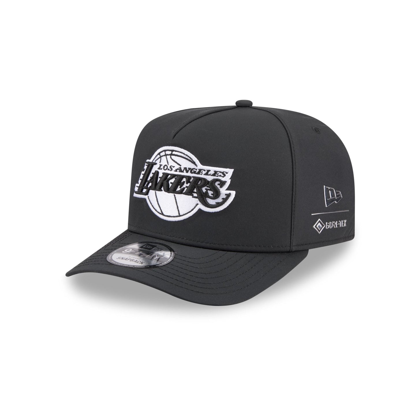 The Los Angeles Lakers GORE-TEX Black 9FIFTY A-Frame Snapback features an embroidered white Lakers logo at the front panels with a metallic sheen silicone New Era Flag logo and GORE-TEX logo at the left-wear side. Additional details include an adjustable snapback closure at the rear, a gray undervisor, and a polyester fabrication throughout the cap. It is waterproof, breathable, and lightweight.