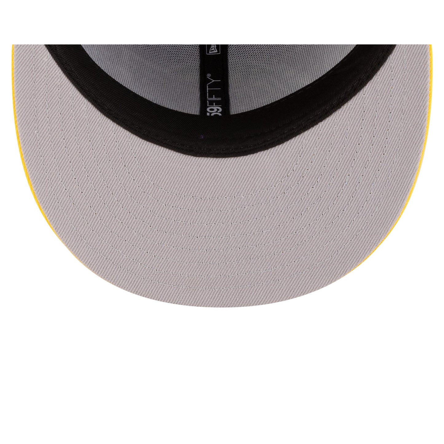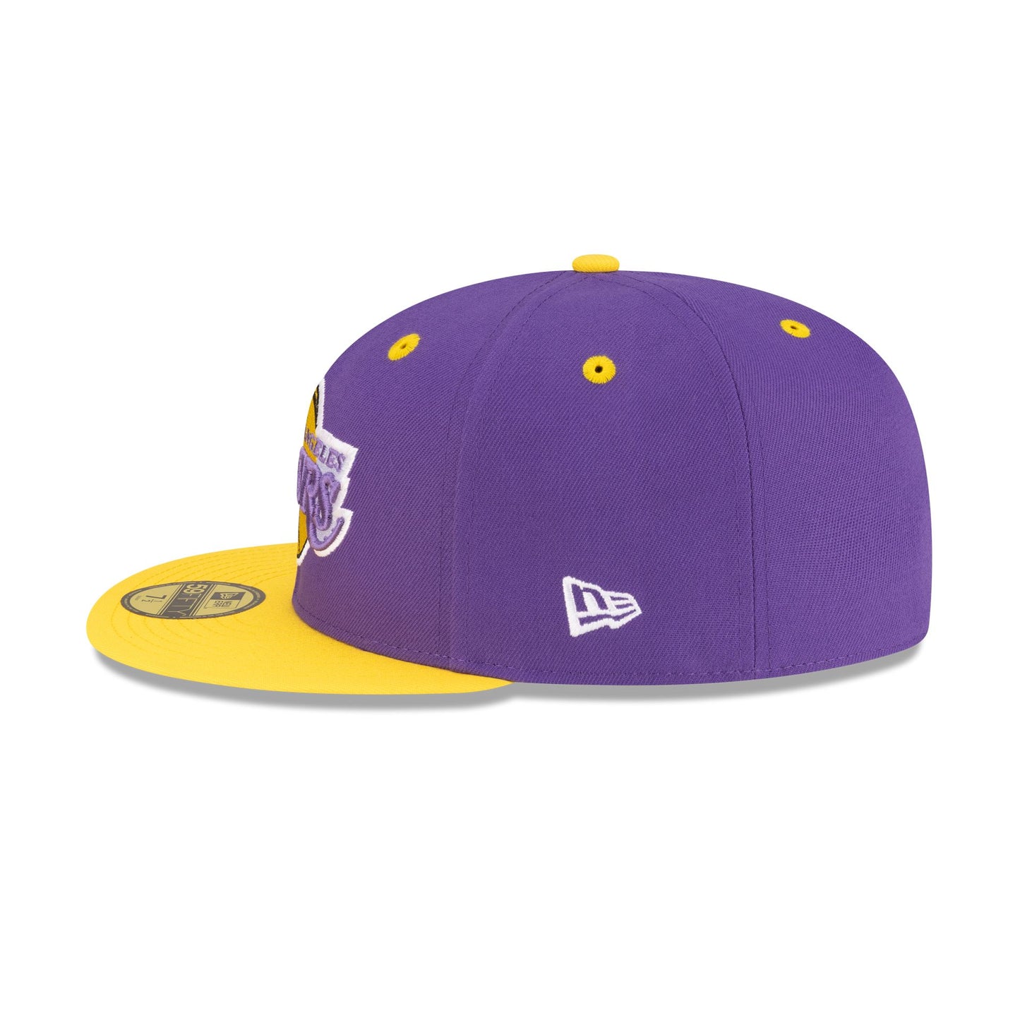 The Los Angeles Lakers Hardwood Classics 80s Two Tone 59FIFTY Fitted Cap features an embroidered 80s Lakers logo at the front panels with the NBA Logoman at the rear and a gray undervisor.