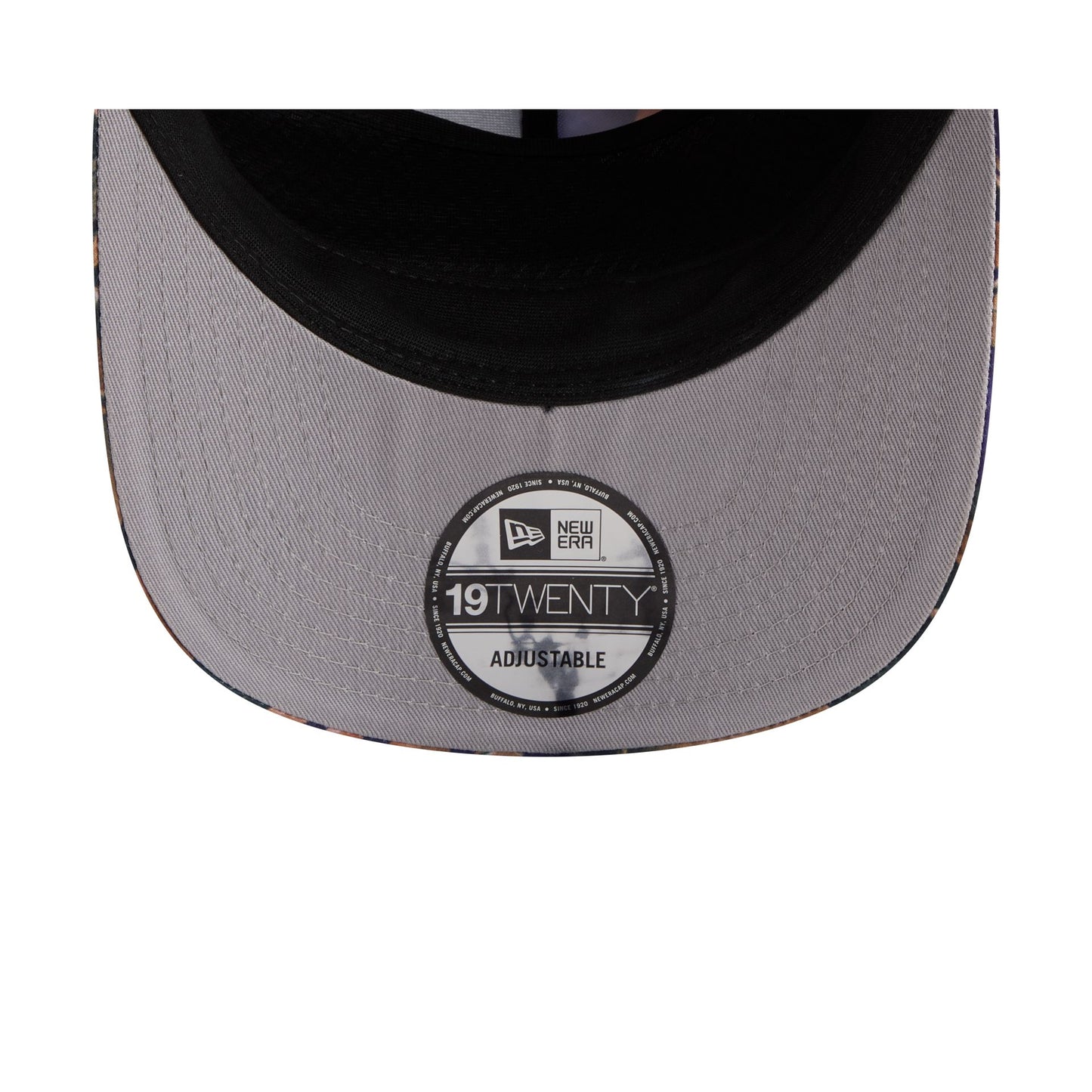 The Los Angeles Lakers Leaves 19TWENTY Adjustable Cap features an embroidered Lakers logo at the front panels with a forest leaves pattern throughout. Additional details include an adjustable snapback closure at the rear and a gray undervisor.