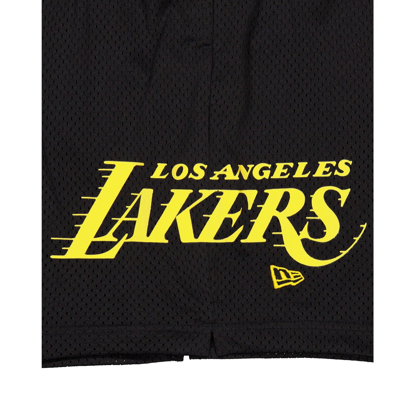 The Los Angeles Lakers Mesh Shorts features a screen-printed Lakers logo at the left leg with a team wordmark at the right leg.