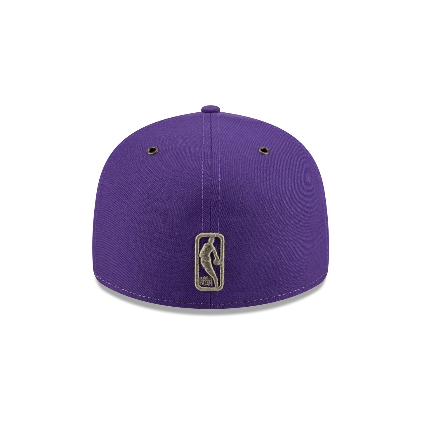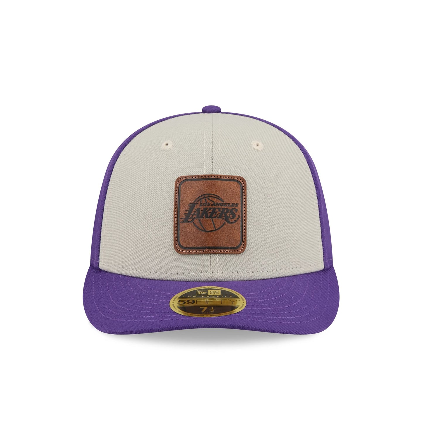 The Los Angeles Lakers Quilted Low Profile 59FIFTY Fitted Cap features a faux leather debossed applique Lakers patch at the front panels with a matching Western Conference team patch at the right-wear side and an embroidered NBA Logoman at the rear.
