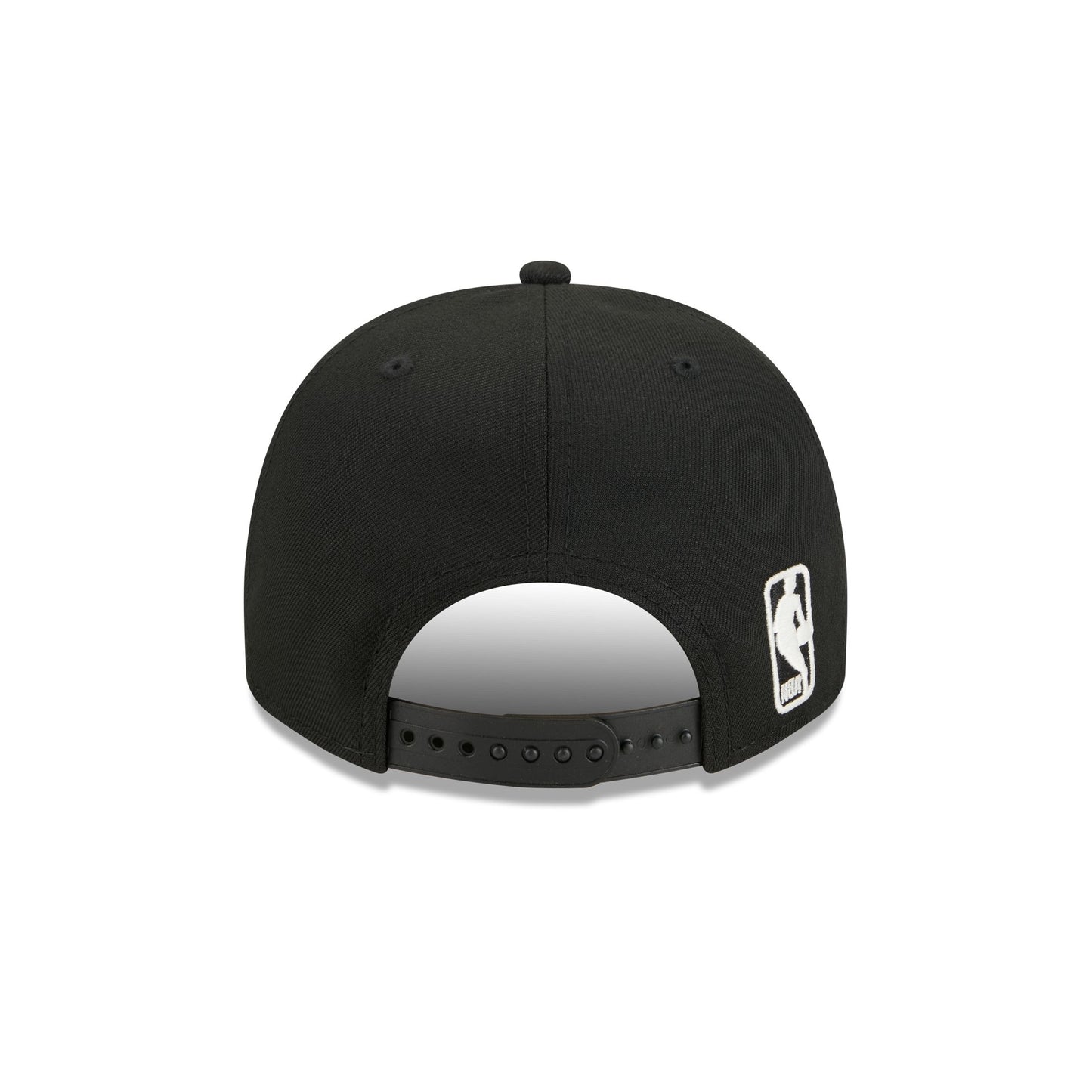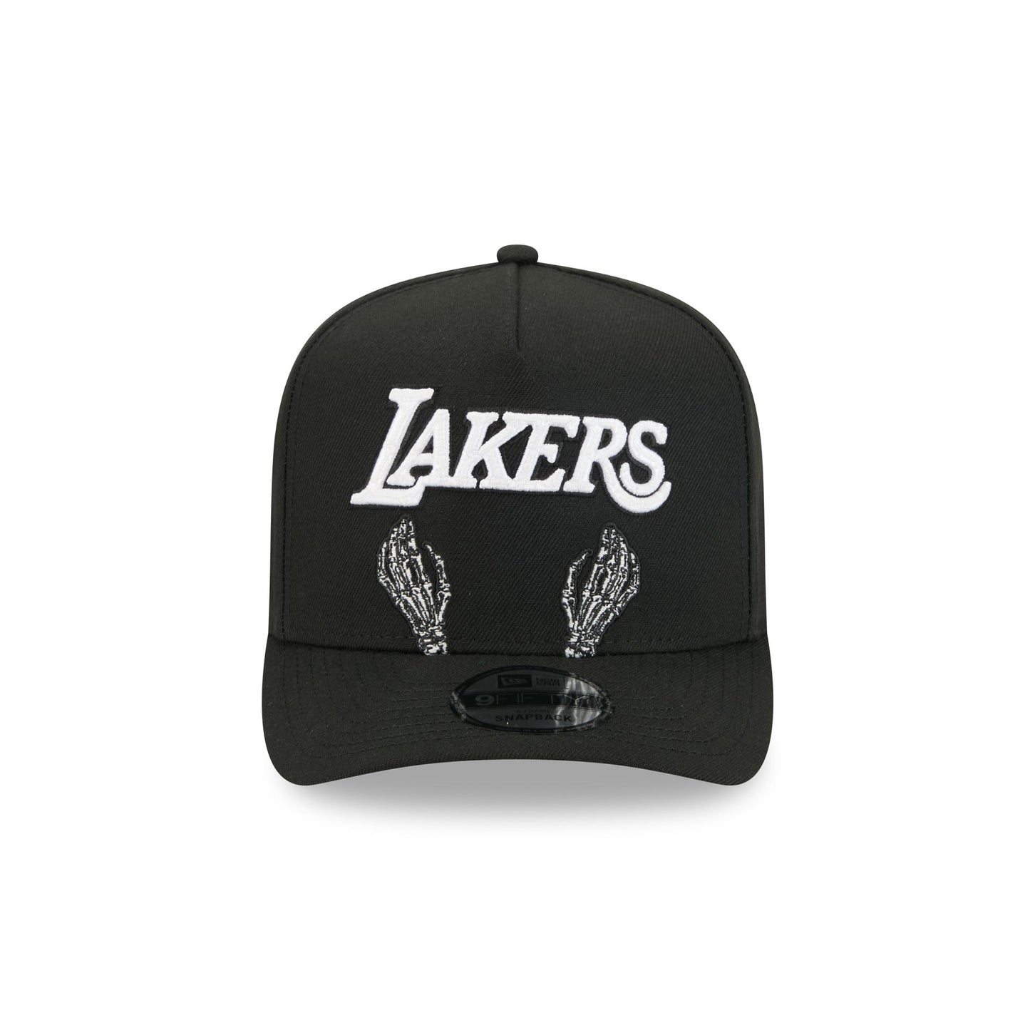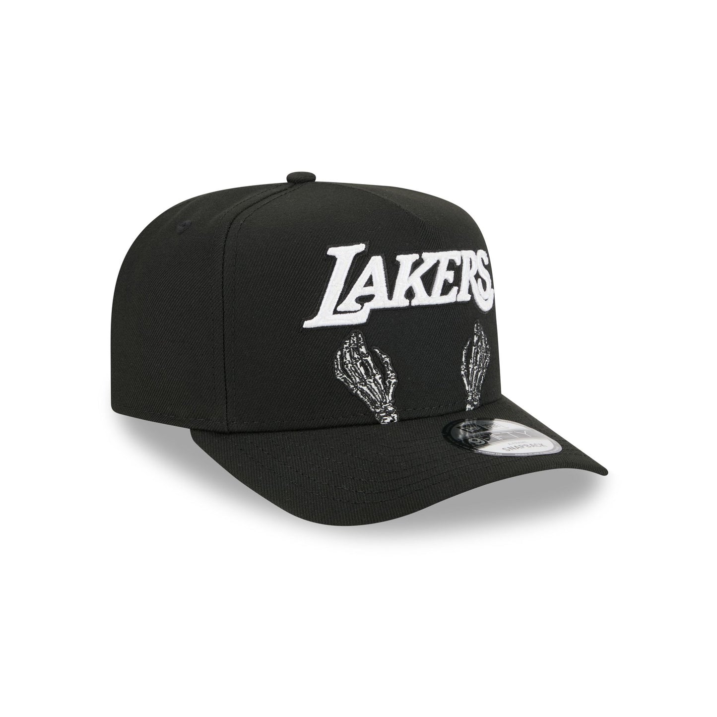 The Los Angeles Lakers Skeletal Script 9FIFTY A-Frame Snapback features a glow-in-the-dark embroidered Lakers wordmark and skeleton hands at the front with an NBA Logoman at the right of a snapback closure at the rear and a gray undervisor.