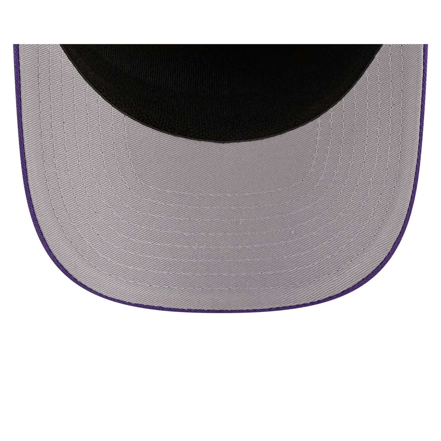The Los Angeles Lakers Split Panel 9SEVENTY Stretch-Snap features an embroidered Lakers logo at the front panel with a split crown construction and a rope at the visor. Additional details include an adjustable stretch-snap closure at the rear and a gray undervisor.
