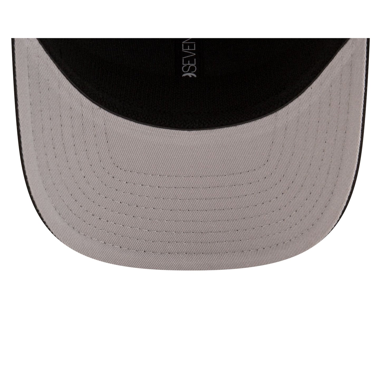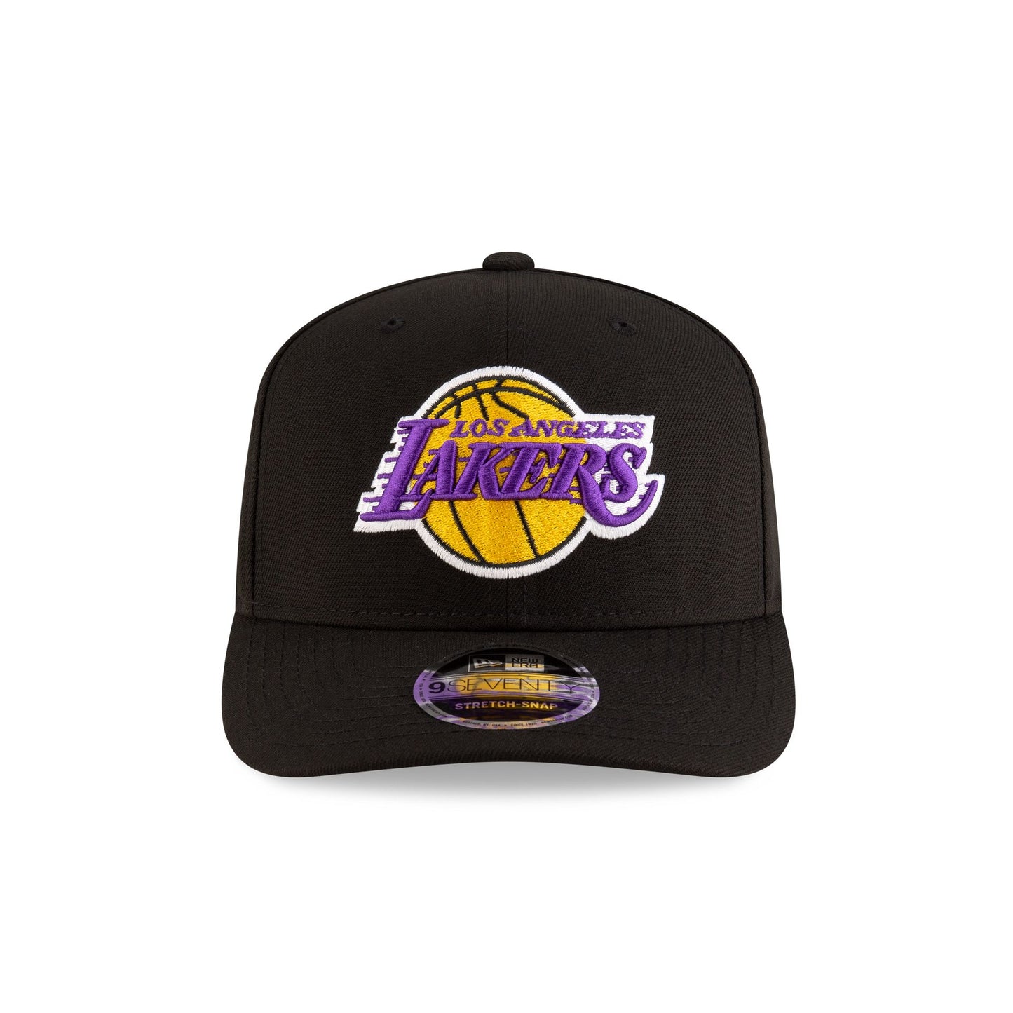 The Los Angeles Lakers Team Black 9SEVENTY Stretch-Snap features an embroidered Lakers logo at the front panels with the NBA Logoman above an adjustable stretch-snap closure at the rear and a gray undervisor.