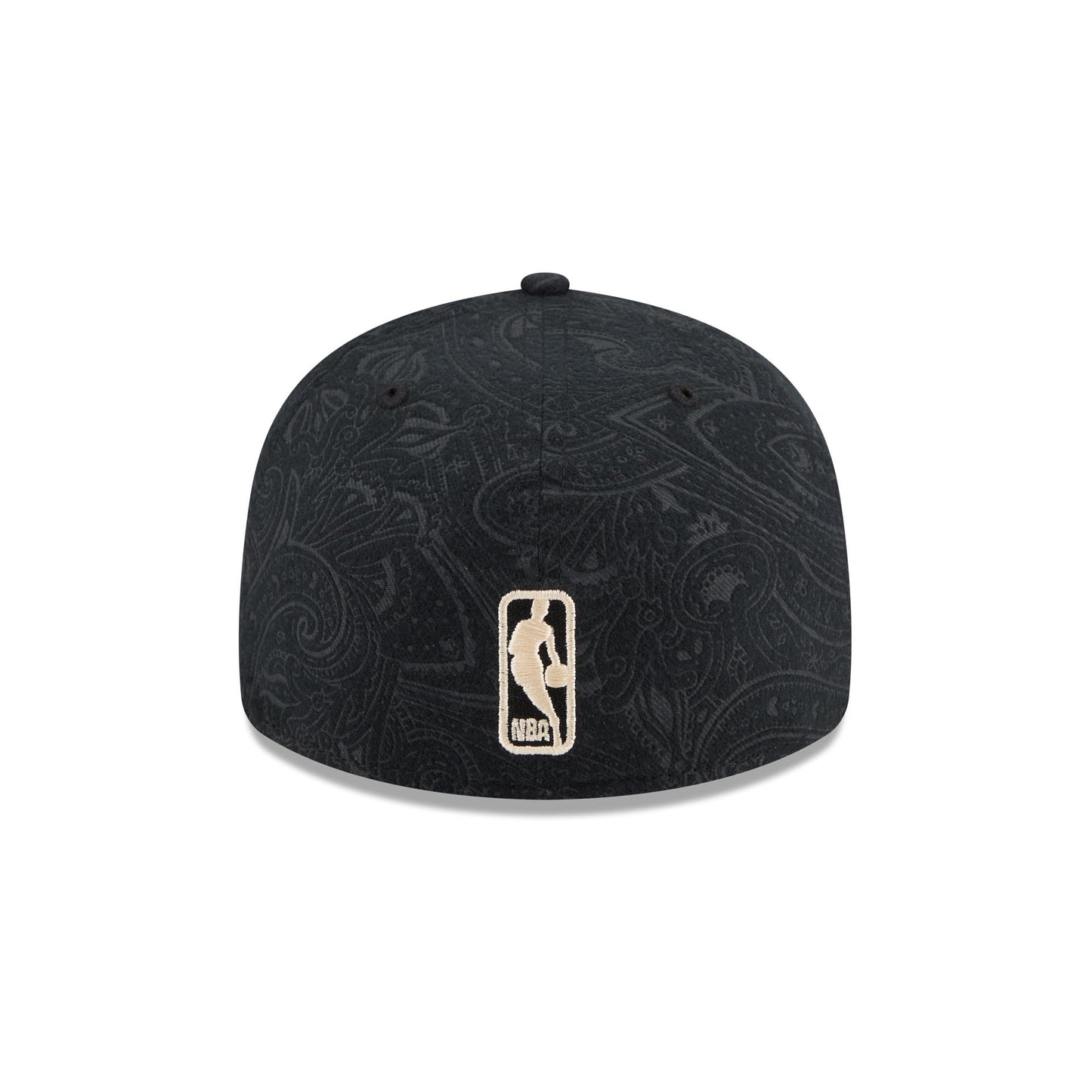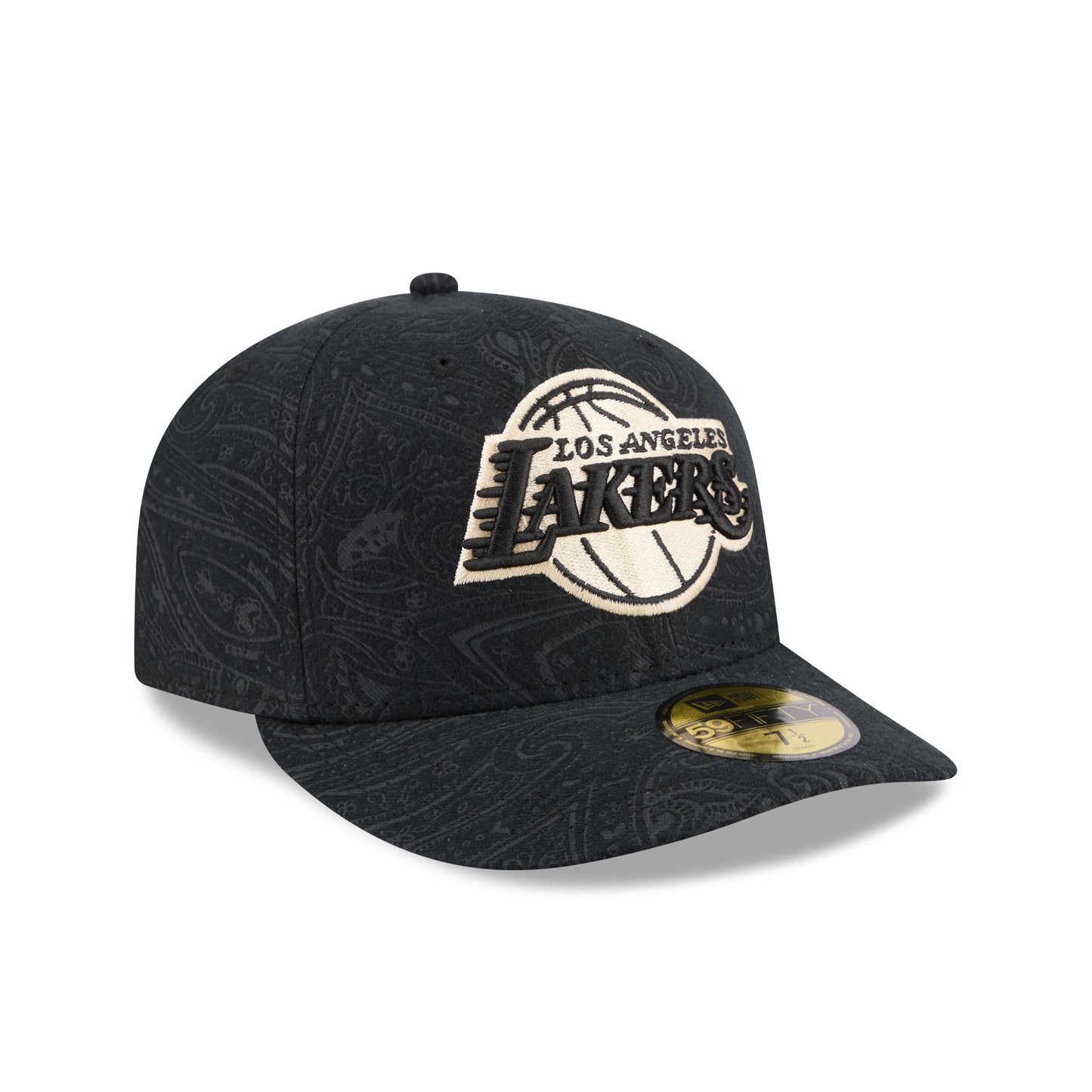 The Los Angeles Lakers Three Looms Brushed Cotton Pre-Curved 59FIFTY Fitted Cap features an embroidered Lakers Hardwood Classics logo at the front panels with a matching NBA Logoman at the rear. Additional details include a paisley printed twill, brushed cotton all over fabrication with a gray undervisor.