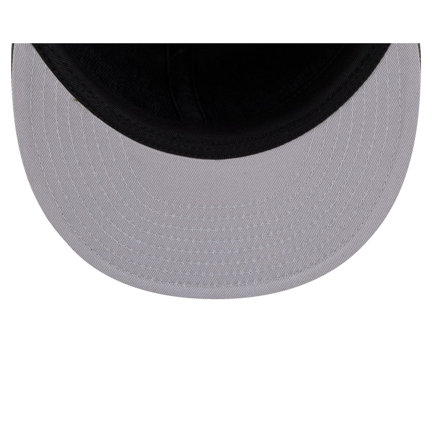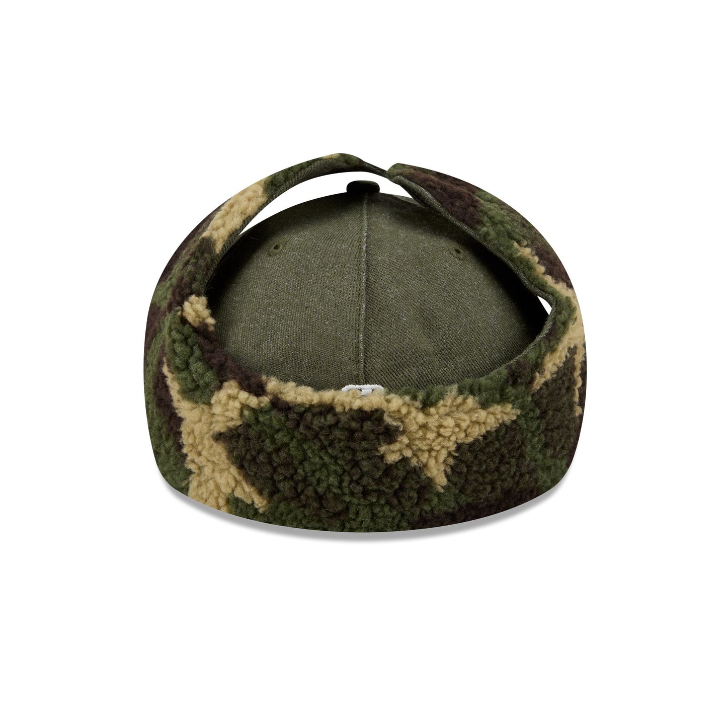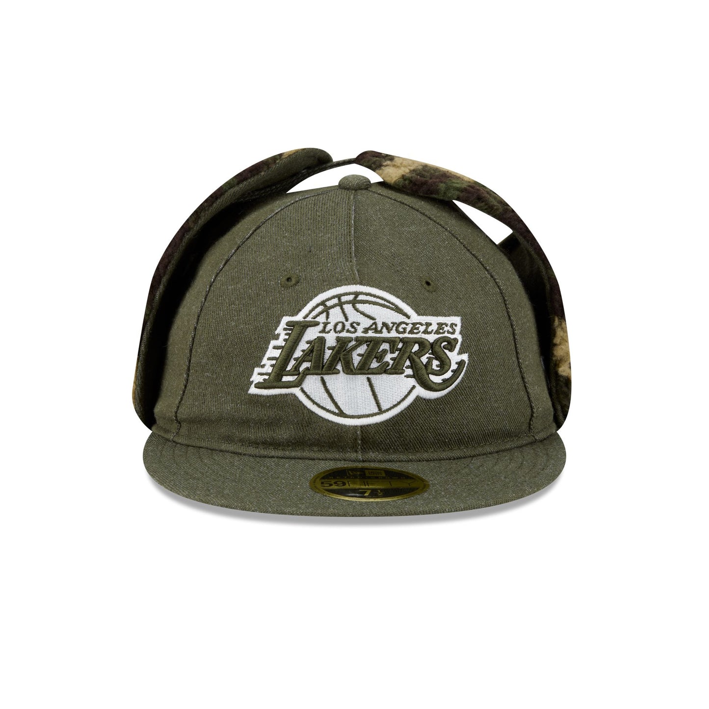 The Los Angeles Lakers Three Looms Cotton Twill Camo Retro Crown Dog Ear 59FIFTY Fitted features an embroidered Lakers logo at the front panels with a matching NBA Logoman at the rear. Additional details include fleece camo lined ear covers with a snap button closure and a gray undervisor.