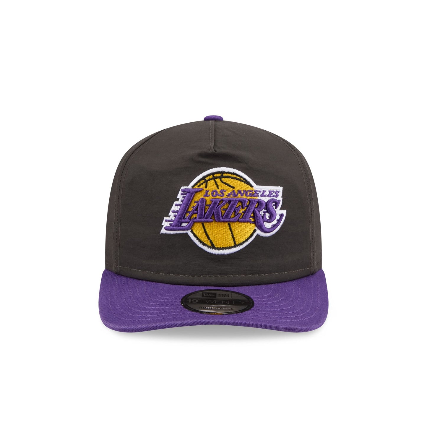 The Los Angeles Lakers Three Looms Nylon Black Pre-Curved 19TWENTY Adjustable Cap features an embroidered Lakers logo at the front panel with an adjustable D-Ring closure at the rear, a purple visor, and a gray undervisor.