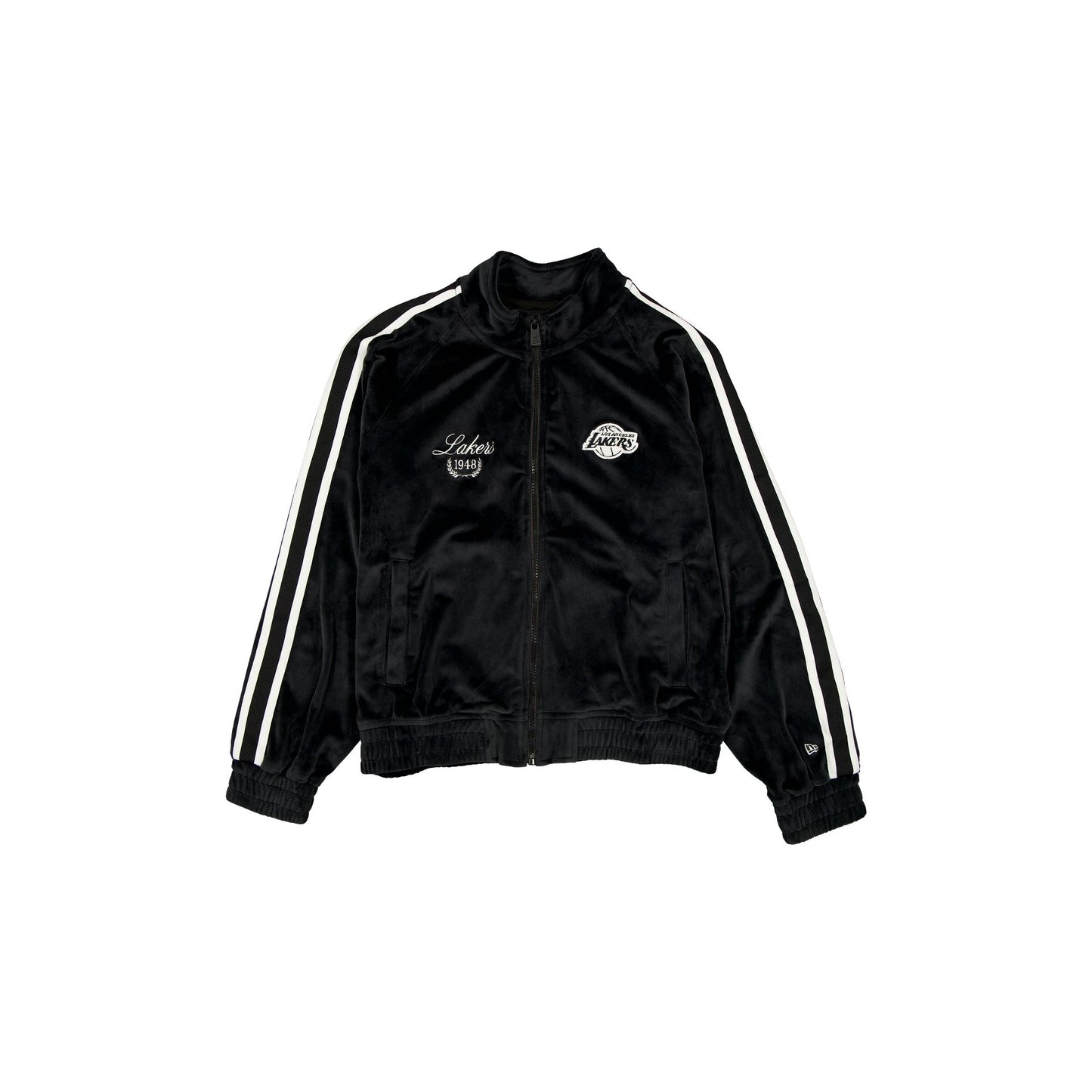 The Los Angeles Lakers Throwback Prep Black Women's Track Jacket features an embroidered Lakers logo at the left chest and script wordmark at the right. Additional details include a full-zip closure and front pockets.