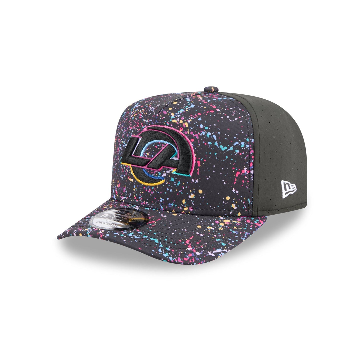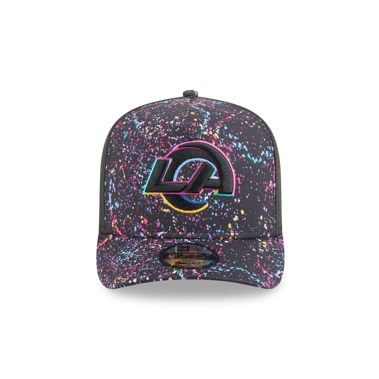 The Los Angeles Rams 2025 Crucial Catch 9FIFTY A-Frame Snapback features an embroidered Rams logo at the front paint splatter panels with a woven NFL Shield tag above a snapback closure at the rear. Additional details include a Crucial Catch Intercept Cancer patch at the right-wear side and a black undervisor.