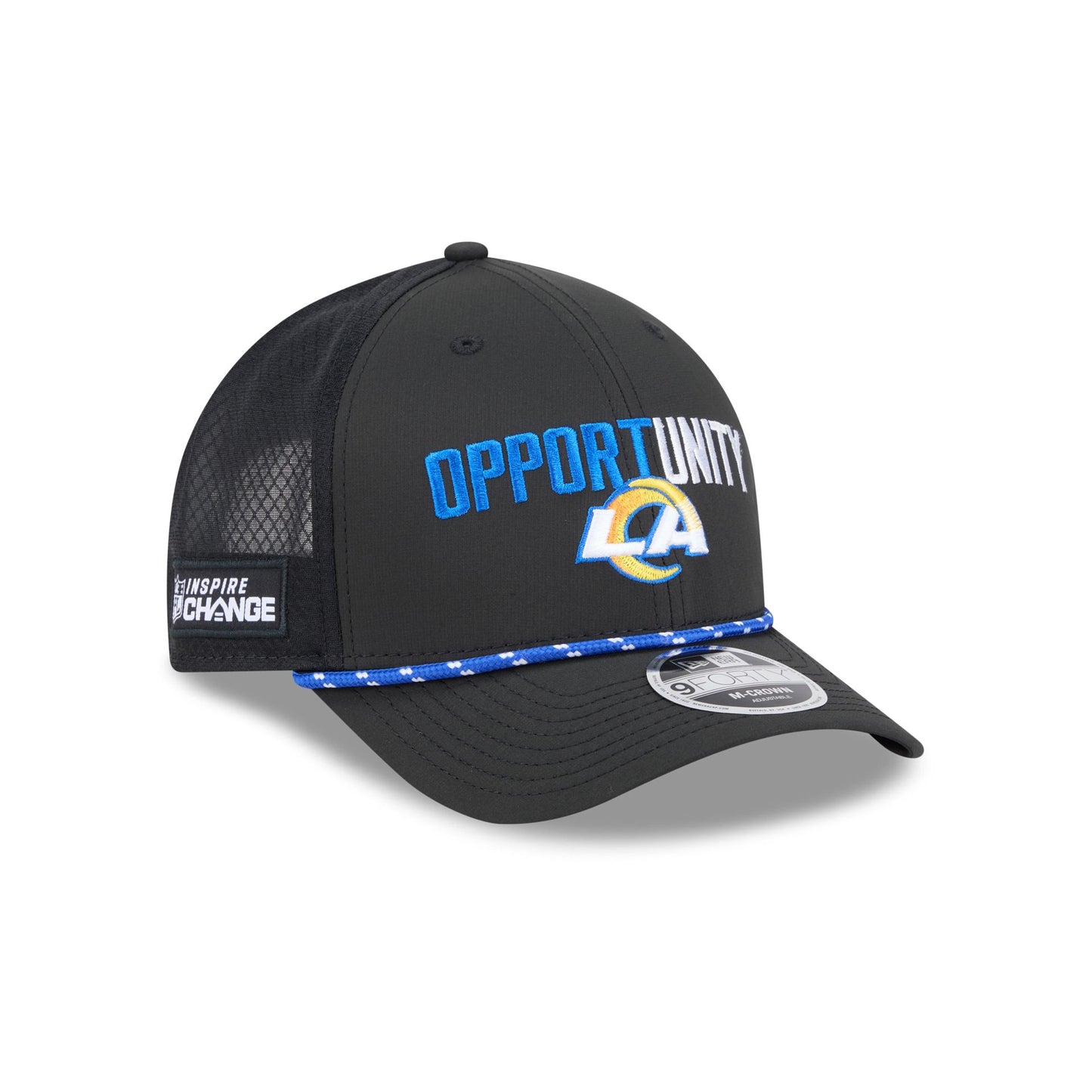 The Los Angeles Rams 2025 Inspire Change 9FORTY M-Crown Snapback features an embroidered Rams logo and matching "Opportunity" wordmark at the front panels with an NFL Inspire Change patch at the right-wear side. Additional details include a rope at the visor and an adjustable snapback closure at the rear.