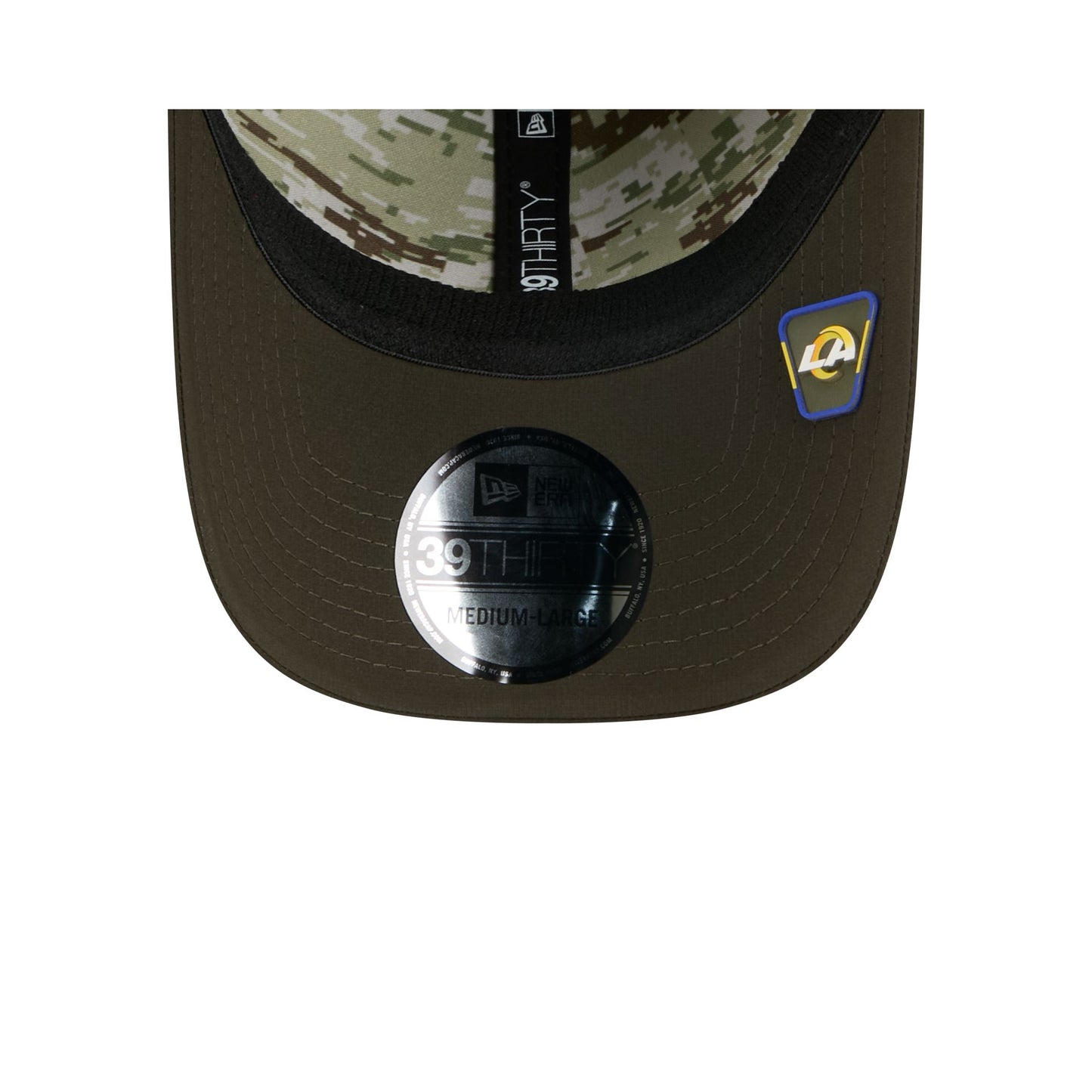 The Los Angeles Rams 2025 Salute to Service 39THIRTY Stretch Fit Cap features an embroidered Rams logo at the front panels with the official NFL Salute to Service patch at the rear and an American flag patch at the right-wear side. Additional details include three green stripes at the visor with a silicone team logo patch at a dark green undervisor and a digi camo interior fabrication.