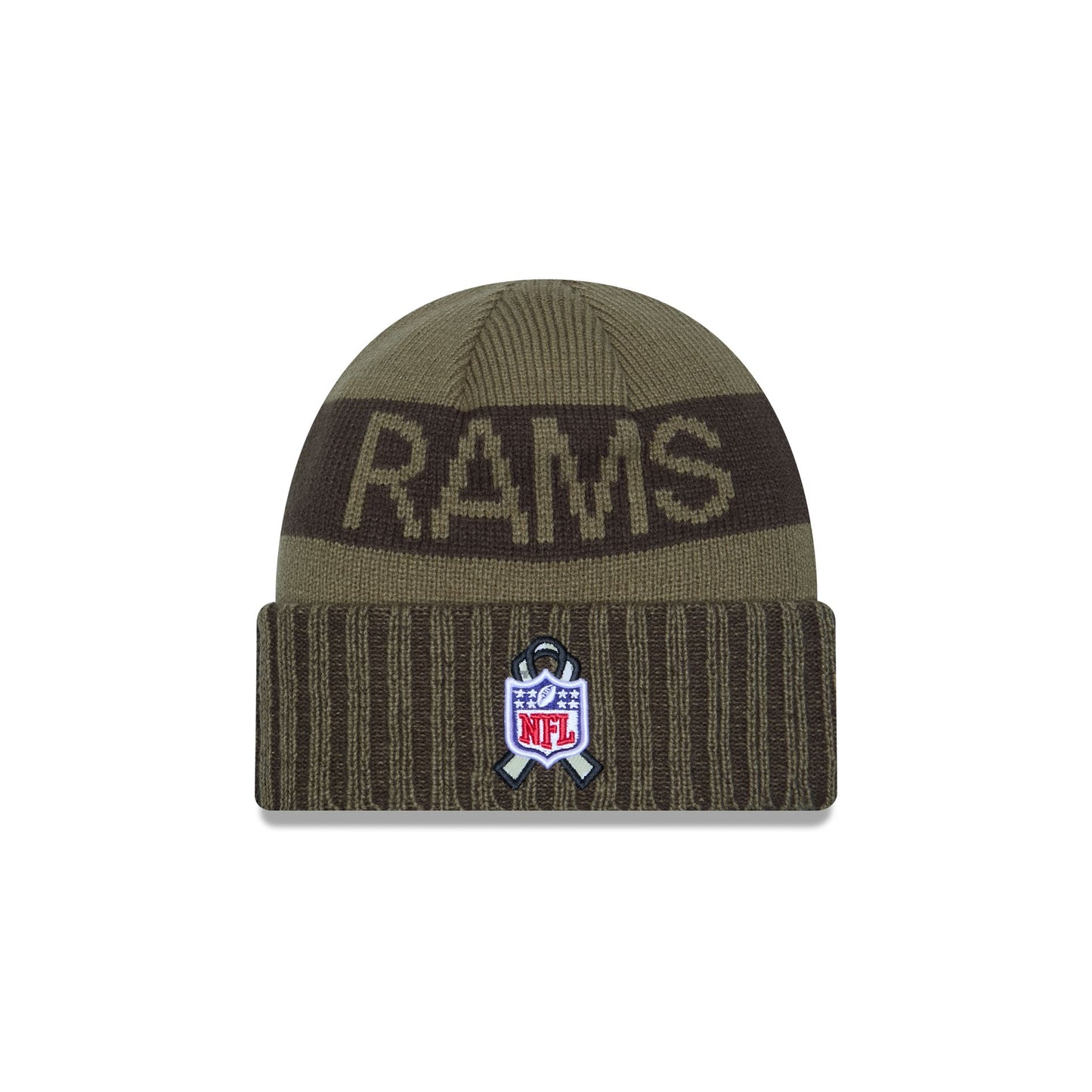 The Los Angeles Rams 2025 Salute to Service Cuff Knit features an embroidered Rams logo at the front with a team wordmark at the crown, an American flag patch at the right-wear side, and the official NFL Salute to Service patch at the rear.