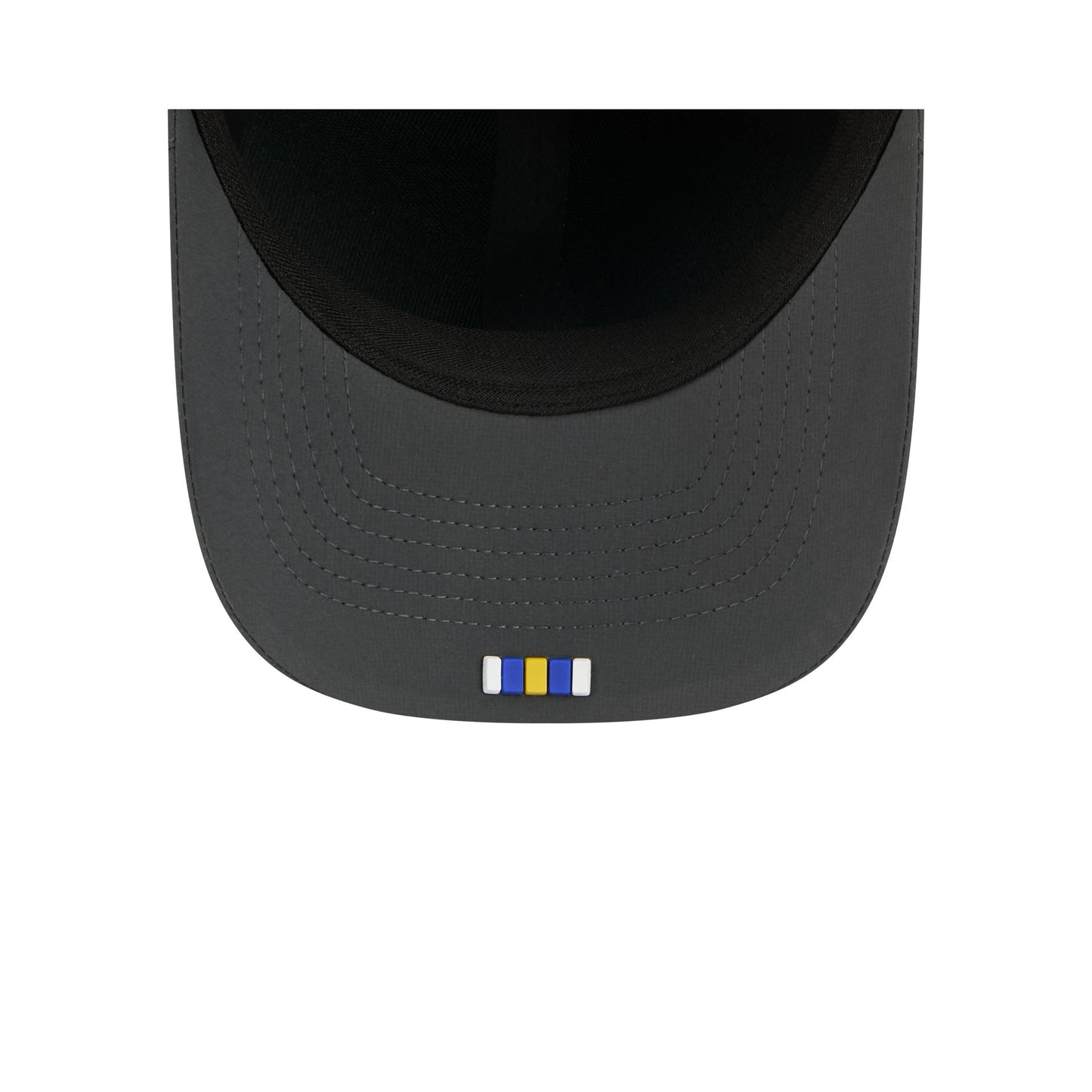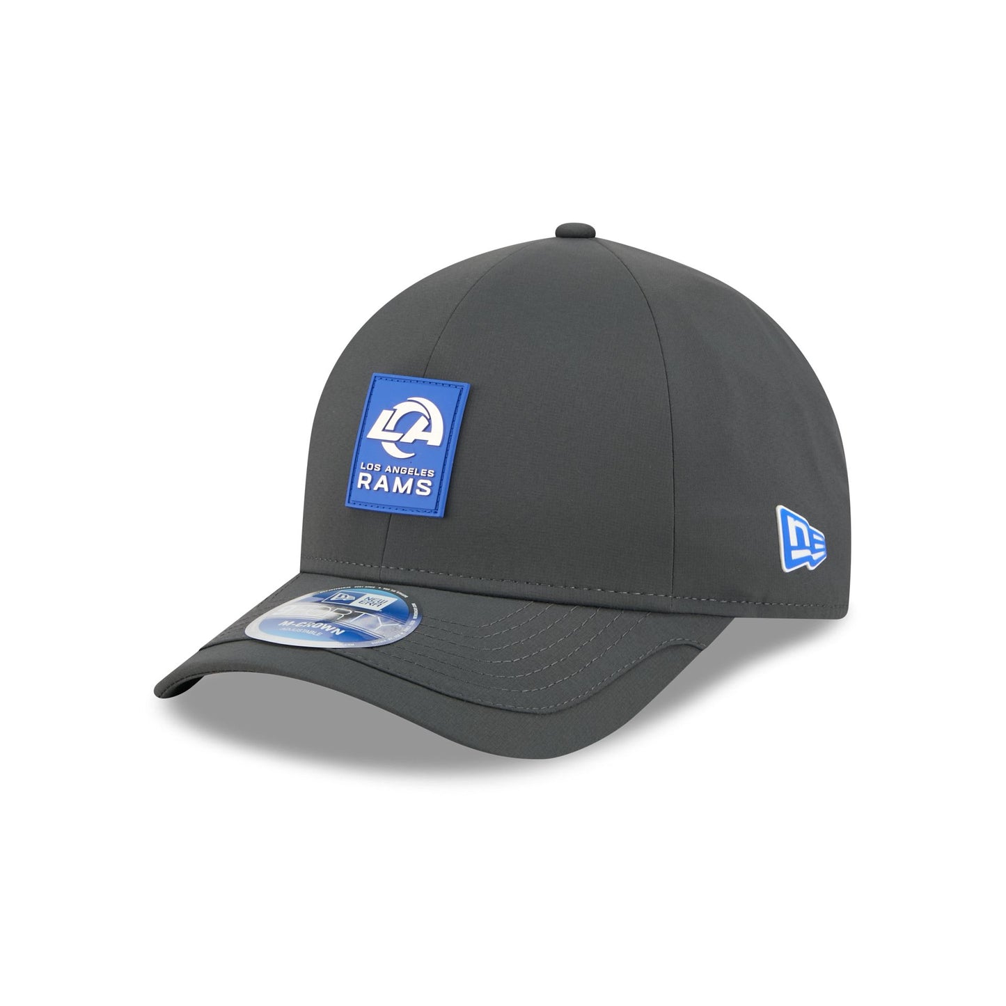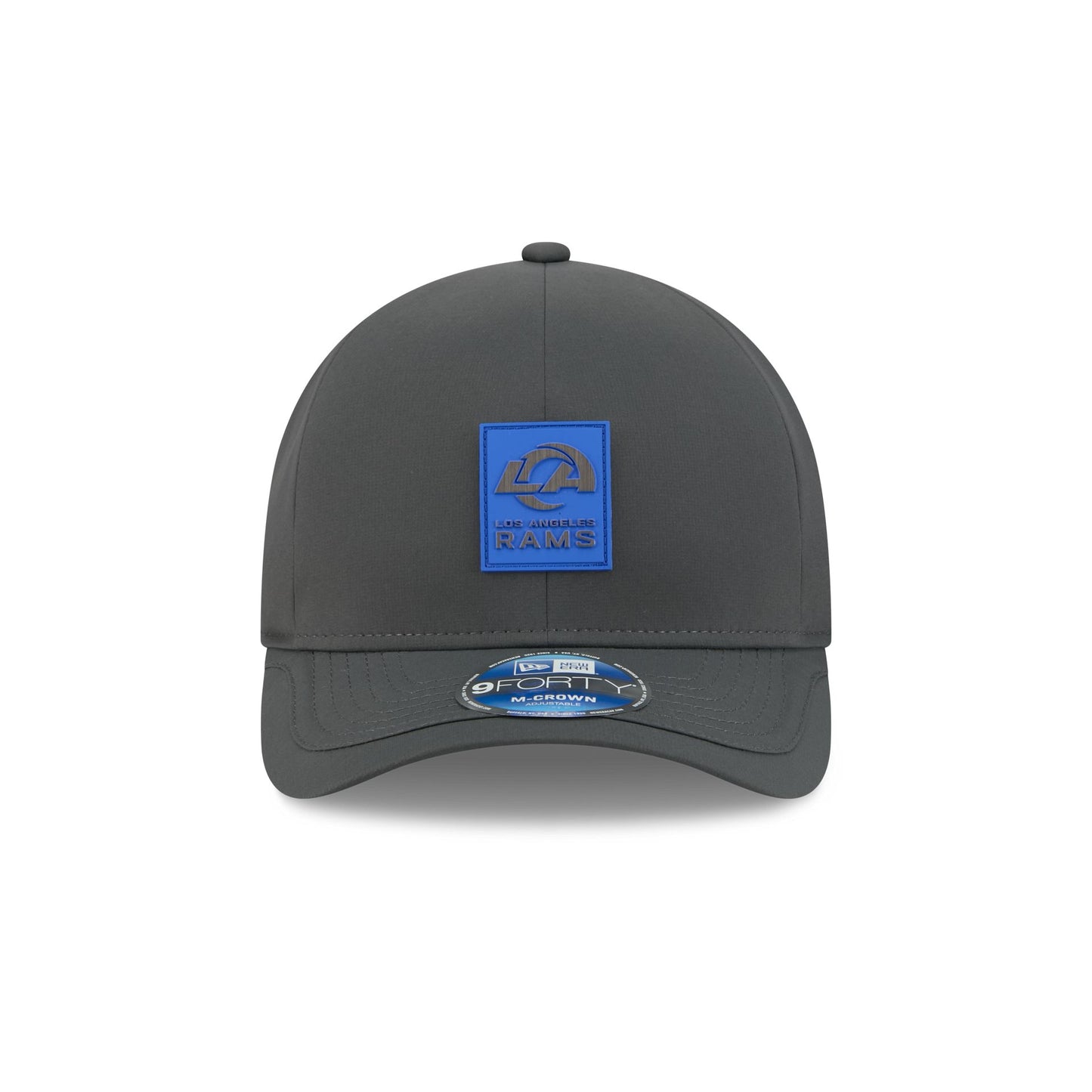 The Los Angeles Rams 2025 Sideline Cold Weather Steel Clouds 9FORTY M-Crown Snapback features a sewn-down silicone Rams logo patch at the front panels with a water-repellent quill tech fabrication throughout and a quick-dry cushioned sweatband to absorb moisture. Additional details include the Official NFL Shield logo to the right of a soft silicone snapback closure at the rear. The crown has bonded seams to trap warmth and the undervisor is accented with a silicone transfer in the team’s colors.