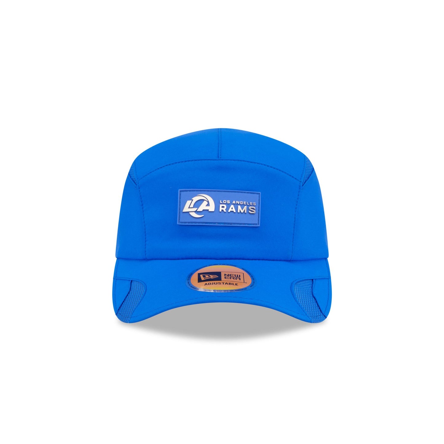 The Los Angeles Rams 2025 Sideline Hot Weather Runner Adjustable Cap features a sewn-down silicone Rams logo patch at the front panels with a water-repellent quill tech fabrication throughout and a quick-dry cushioned sweatband to absorb moisture. Additional details include the Official NFL Shield logo to the right of an adjustable hook-and-loop closure at the rear and mesh accents at the visor sides and side crown panels. The closure is accented with mesh a silicone transfer in the team’s colors.