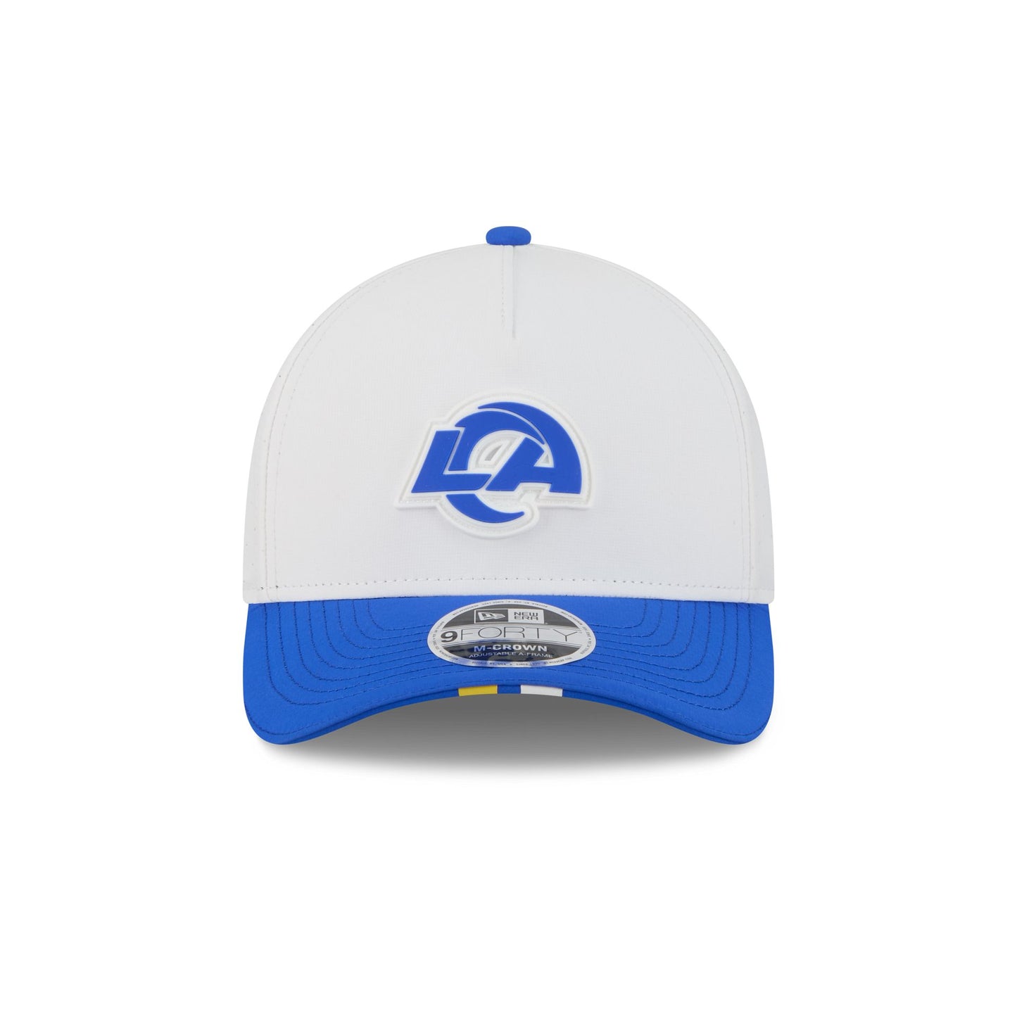 The Los Angeles Rams 2025 Training 9FORTY M-Crown A-Frame Snapback features a silicone Rams patch at the front panel with team color stripes at the front of a blue visor. Additional details include a silicone NFL Shield patch on a woven foldover tab above a snapback closure at the rear.
