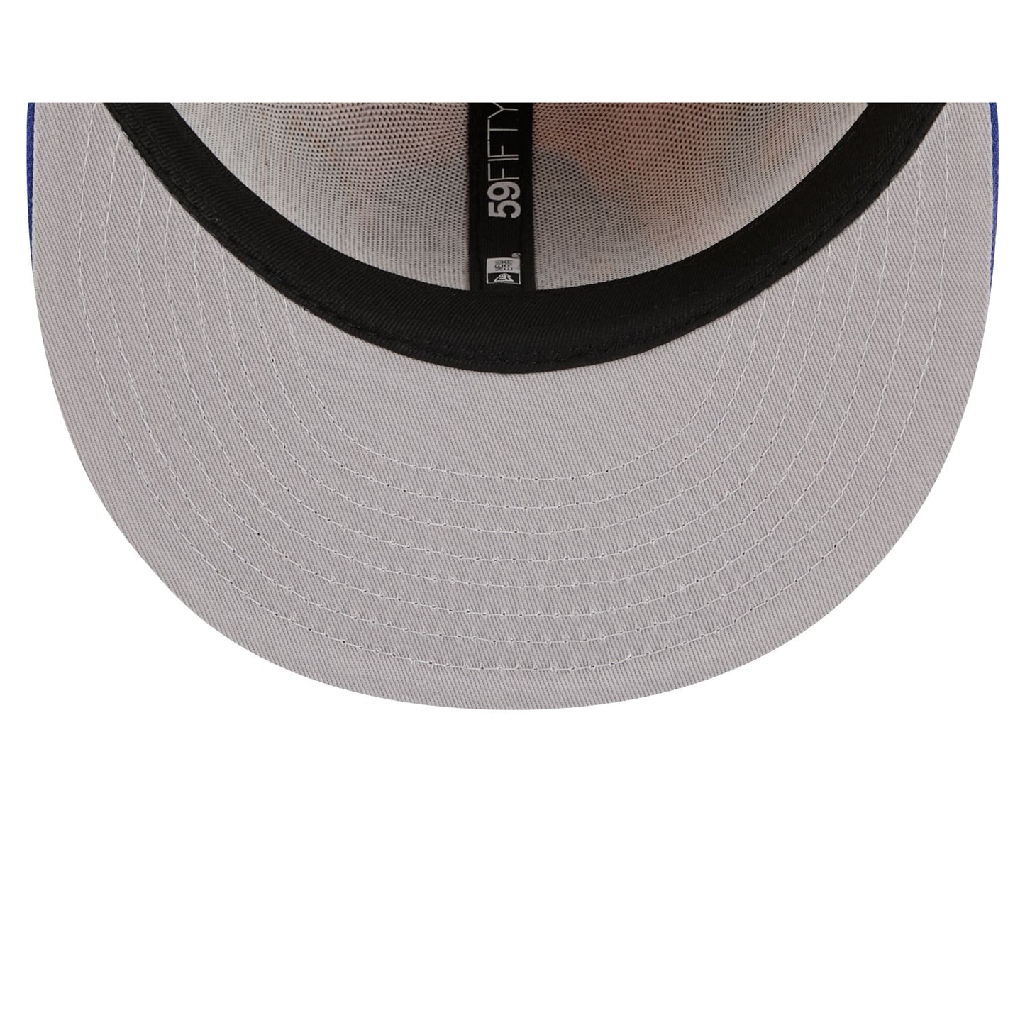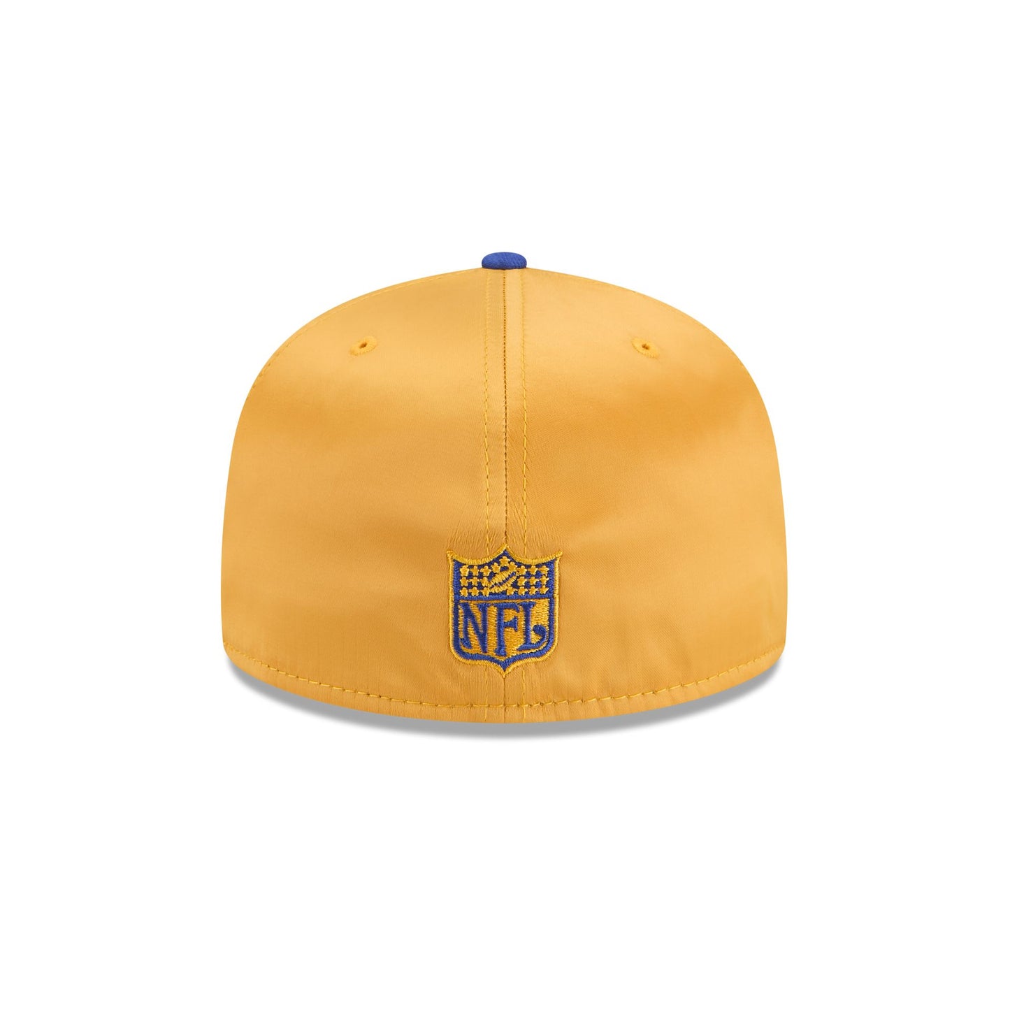 The Los Angeles Rams Bold Satin 59FIFTY Fitted Cap features an embroidered satin Rams Historic graphic at the front panels with a satin fabrication throughout. Additional details include a matching NFL Shield logo at the rear and a gray undervisor.