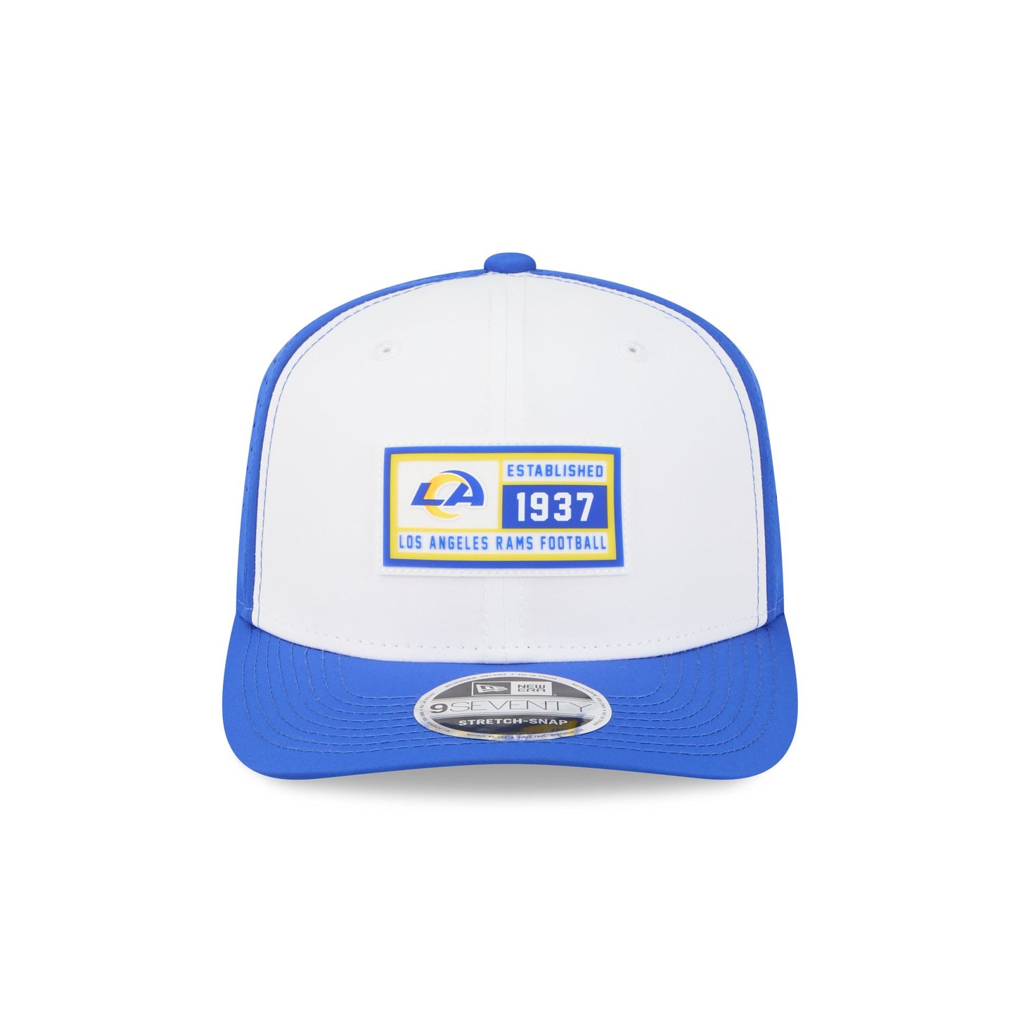 The Los Angeles Rams Est. Patch 9SEVENTY Stretch-Snap features a woven silicone Rams establishment patch at the front panels with a slant-snap closure at a performance mesh rear and a gray undervisor.
